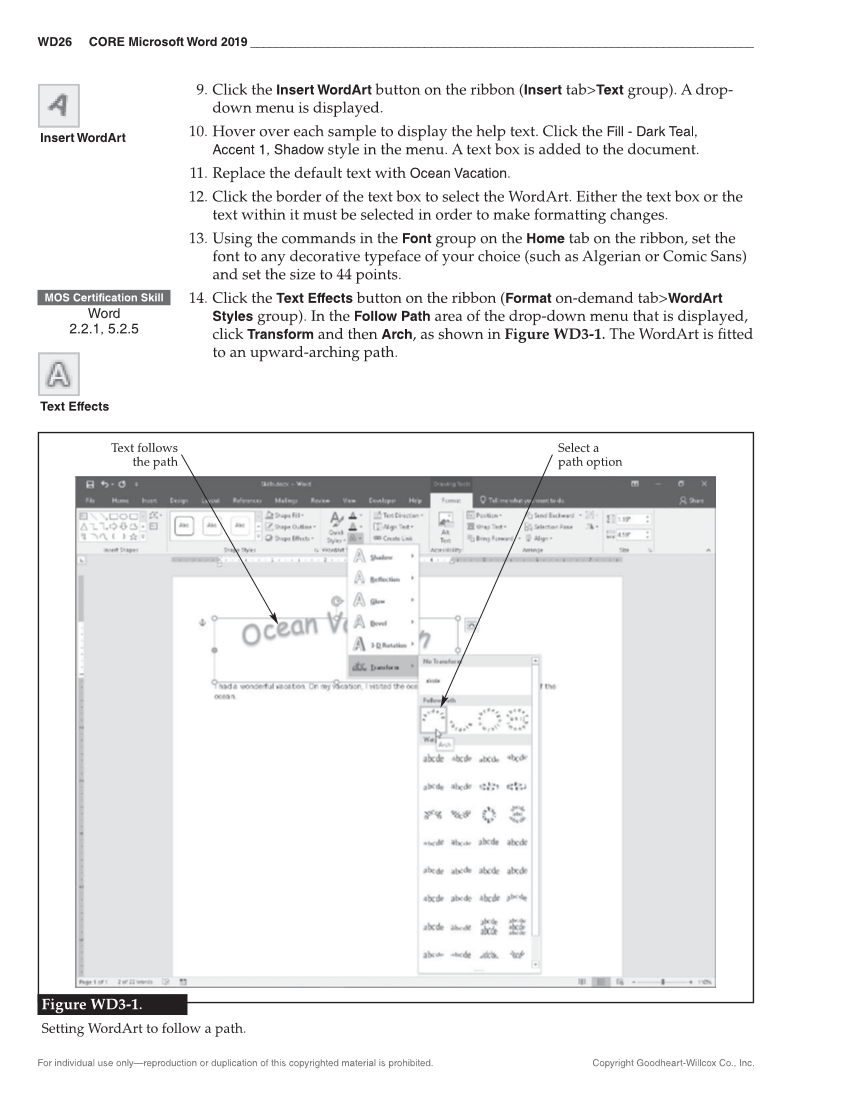WD26 CORE Microsoft Word 2019 ______________________________________________________________________________ For individual use only—reproduction or duplication of this copyrighted material is prohibited. Copyright Goodheart-Willcox Co., Inc. 9. Click the Insert WordArt button on the ribbon (Insert tabText group). A drop- down menu is displayed. 10. Hover over each sample to display the help text. Click the Fill - Dark Teal, Accent 1, Shadow style in the menu. A text box is added to the document. 11. Replace the default text with Ocean Vacation. 12. Click the border of the text box to select the WordArt. Either the text box or the text within it must be selected in order to make formatting changes. 13. Using the commands in the Font group on the Home tab on the ribbon, set the font to any decorative typeface of your choice (such as Algerian or Comic Sans) and set the size to 44 points. 14. Click the Text Effects button on the ribbon (Format on-demand tabWordArt Styles group). In the Follow Path area of the drop-down menu that is displayed, click Transform and then Arch, as shown in Figure WD3-1. The WordArt is fi tted to an upward-arching path. Insert WordArt MOS Certification Skill Word 2.2.1, 5.2.5 Text Effects Select a path option Text follows the path Figure WD3-1. Setting WordArt to follow a path.
