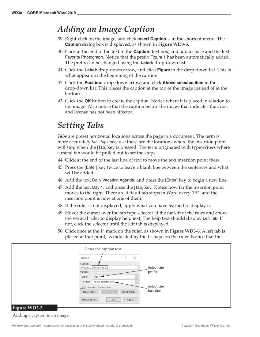 WD30 CORE Microsoft Word 2019 ______________________________________________________________________________ For individual use only—reproduction or duplication of this copyrighted material is prohibited. Copyright Goodheart-Willcox Co., Inc. Adding an Image Caption 39. Right-click on the image, and click Insert Caption… in the shortcut menu. The Caption dialog box is displayed, as shown in Figure WD3-5. 40. Click at the end of the text in the Caption: text box, and add a space and the text Favorite Photograph. Notice that the prefi x Figure 1 has been automatically added. The prefi x can be changed using the Label: drop-down list. 41. Click the Label: drop-down arrow, and click Figure in the drop-down list. This is what appears at the beginning of the caption. 42. Click the Position: drop-down arrow, and click Above selected item in the drop-down list. This places the caption at the top of the image instead of at the bottom. 43. Click the OK button to create the caption. Notice where it is placed in relation to the image. Also notice that the caption below the image that indicates the artist and license has not been affected. Setting Tabs Tabs are preset horizontal locations across the page in a document. The term is more accurately tab stops because these are the locations where the insertion point will stop when the [Tab] key is pressed. The term originated with typewriters where a metal tab would be pulled out to set the stops. 44. Click at the end of the last line of text to move the text insertion point there. 45. Press the [Enter] key twice to leave a blank line between the sentences and what will be added. 46. Add the text Daily Vacation Agenda, and press the [Enter] key to begin a new line. 47. Add the text Day 1, and press the [Tab] key. Notice how far the insertion point moves to the right. There are default tab stops in Word every 0.5, and the insertion point is now at one of them. 48. If the ruler is not displayed, apply what you have learned to display it. 49. Hover the cursor over the tab type selector at the far left of the ruler and above the vertical ruler to display help text. The help text should display Left Tab. If not, click the selector until the left tab is displayed. 50. Click once at the 1 mark on the ruler, as shown in Figure WD3-6. A left tab is placed at that point, as indicated by the L shape on the ruler. Notice that the Enter the caption text Select the location Select the prefix Figure WD3-5. Adding a caption to an image.
