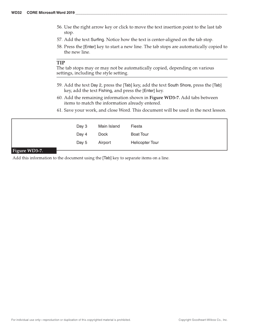 WD32 CORE Microsoft Word 2019 ______________________________________________________________________________ For individual use only—reproduction or duplication of this copyrighted material is prohibited. Copyright Goodheart-Willcox Co., Inc. 56. Use the right arrow key or click to move the text insertion point to the last tab stop. 57. Add the text Surfing. Notice how the text is center-aligned on the tab stop. 58. Press the [Enter] key to start a new line. The tab stops are automatically copied to the new line. TIP The tab stops may or may not be automatically copied, depending on various settings, including the style setting. 59. Add the text Day 2, press the [Tab] key, add the text South Shore, press the [Tab] key, add the text Fishing, and press the [Enter] key. 60. Add the remaining information shown in Figure WD3-7. Add tabs between items to match the information already entered. 61. Save your work, and close Word. This document will be used in the next lesson. Day 3 Main Island Fiesta Day 4 Dock Boat Tour Day 5 Airport Helicopter Tour Figure WD3-7. Add this information to the document using the [Tab] key to separate items on a line.