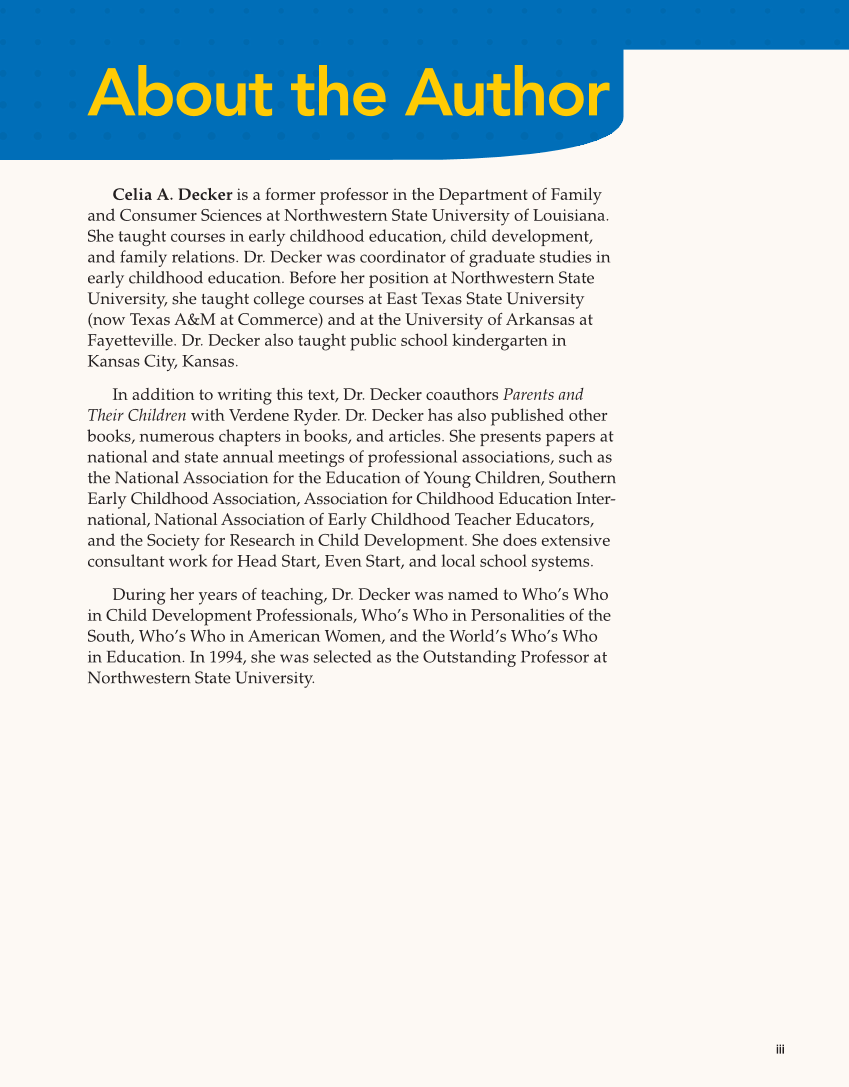 iii About the Author Celia A. Decker is a former professor in the Department of Family and Consumer Sciences at Northwestern State University of Louisiana. She taught courses in early childhood education, child development, and family relations. Dr. Decker was coordinator of graduate studies in early childhood education. Before her position at Northwestern State University, she taught college courses at East Texas State University (now Texas A&M at Commerce) and at the University of Arkansas at Fayetteville. Dr. Decker also taught public school kindergarten in Kansas City, Kansas. In addition to writing this text, Dr. Decker coauthors Parents and Their Children with Verdene Ryder. Dr. Decker has also published other books, numerous chapters in books, and articles. She presents papers at national and state annual meetings of professional associations, such as the National Association for the Education of Young Children, Southern Early Childhood Association, Association for Childhood Education Inter- national, National Association of Early Childhood Teacher Educators, and the Society for Research in Child Development. She does extensive consultant work for Head Start, Even Start, and local school systems. During her years of teaching, Dr. Decker was named to Who’s Who in Child Development Professionals, Who’s Who in Personalities of the South, Who’s Who in American Women, and the World’s Who’s Who in Education. In 1994, she was selected as the Outstanding Professor at Northwestern State University.
