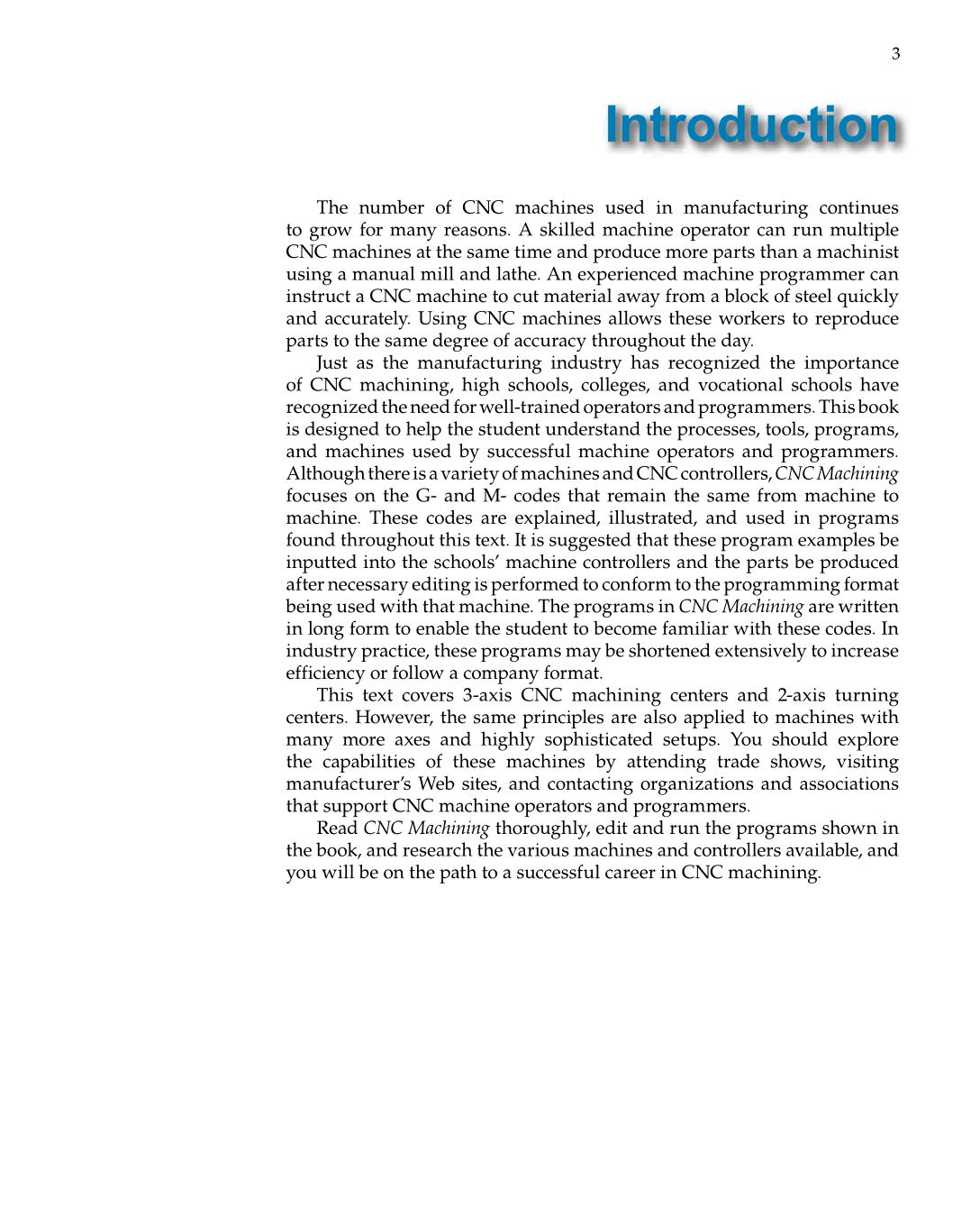 This text covers 3-axis CNC machining centers and 2-axis turning