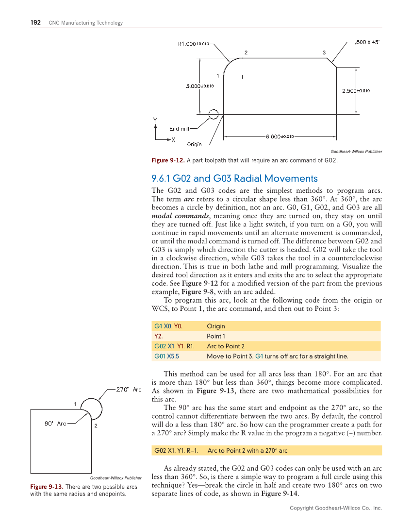 Copyright Goodheart-Willcox Co., Inc. 192 CNC Manufacturing Technology 9.6.1 G02 and G03 Radial Movements The G02 and G03 codes are the simplest methods to program arcs. The term arc refers to a circular shape less than 360°. At 360°, the arc becomes a circle by definition, not an arc. G0, G1, G02, and G03 are all modal commands, meaning once they are turned on, they stay on until they are turned off. Just like a light switch, if you turn on a G0, you will continue in rapid movements until an alternate movement is commanded, or until the modal command is turned off. The difference between G02 and G03 is simply which direction the cutter is headed. G02 will take the tool in a clockwise direction, while G03 takes the tool in a counterclockwise direction. This is true in both lathe and mill programming. Visualize the desired tool direction as it enters and exits the arc to select the appropriate code. See Figure 9-12 for a modified version of the part from the previous example, Figure 9-8, with an arc added. To program this arc, look at the following code from the origin or WCS, to Point 1, the arc command, and then out to Point 3: G1 X0. Y0. Origin Y2. Point 1 G02 X1. Y1. R1. Arc to Point 2 G01 X5.5 Move to Point 3. G1 turns off arc for a straight line. This method can be used for all arcs less than 180°. For an arc that is more than 180° but less than 360°, things become more complicated. As shown in Figure 9-13, there are two mathematical possibilities for this arc. The 90° arc has the same start and endpoint as the 270° arc, so the control cannot differentiate between the two arcs. By default, the control will do a less than 180° arc. So how can the programmer create a path for a 270° arc? Simply make the R value in the program a negative (−) number. G02 X1. Y1. R−1. Arc to Point 2 with a 270° arc As already stated, the G02 and G03 codes can only be used with an arc less than 360°. So, is there a simple way to program a full circle using this technique? Yes—break the circle in half and create two 180° arcs on two separate lines of code, as shown in Figure 9-14. Goodheart-Willcox Publisher Figure 9-12. A part toolpath that will require an arc command of G02. 2 1 3 Goodheart-Willcox Publisher Figure 9-13. There are two possible arcs with the same radius and endpoints. 1 2