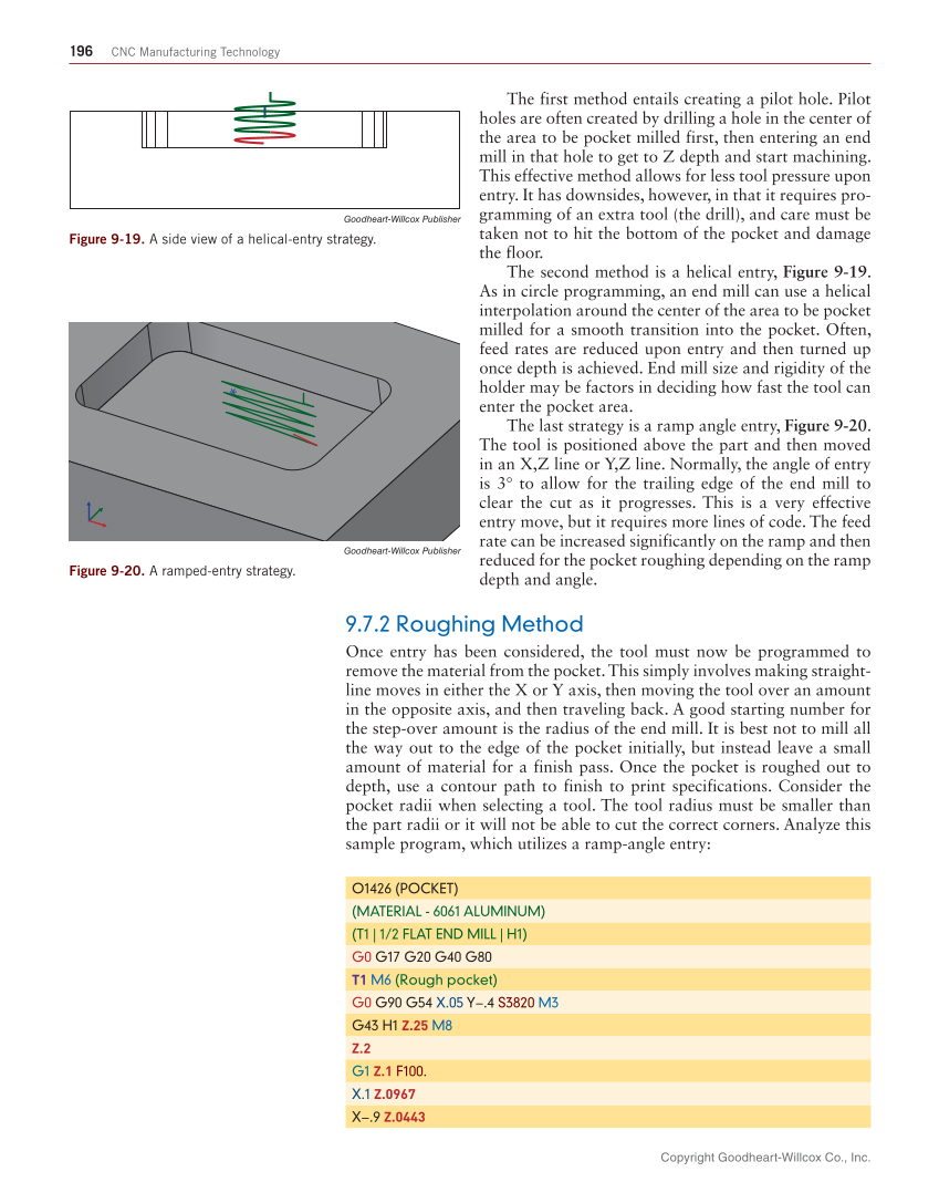 Copyright Goodheart-Willcox Co., Inc. 196 CNC Manufacturing Technology The first method entails creating a pilot hole. Pilot holes are often created by drilling a hole in the center of the area to be pocket milled first, then entering an end mill in that hole to get to Z depth and start machining. This effective method allows for less tool pressure upon entry. It has downsides, however, in that it requires pro- gramming of an extra tool (the drill), and care must be taken not to hit the bottom of the pocket and damage the floor. The second method is a helical entry, Figure 9-19. As in circle programming, an end mill can use a helical interpolation around the center of the area to be pocket milled for a smooth transition into the pocket. Often, feed rates are reduced upon entry and then turned up once depth is achieved. End mill size and rigidity of the holder may be factors in deciding how fast the tool can enter the pocket area. The last strategy is a ramp angle entry, Figure 9-20. The tool is positioned above the part and then moved in an X,Z line or Y,Z line. Normally, the angle of entry is 3° to allow for the trailing edge of the end mill to clear the cut as it progresses. This is a very effective entry move, but it requires more lines of code. The feed rate can be increased significantly on the ramp and then reduced for the pocket roughing depending on the ramp depth and angle. 9.7.2 Roughing Method Once entry has been considered, the tool must now be programmed to remove the material from the pocket. This simply involves making straight- line moves in either the X or Y axis, then moving the tool over an amount in the opposite axis, and then traveling back. A good starting number for the step-over amount is the radius of the end mill. It is best not to mill all the way out to the edge of the pocket initially, but instead leave a small amount of material for a finish pass. Once the pocket is roughed out to depth, use a contour path to finish to print specifications. Consider the pocket radii when selecting a tool. The tool radius must be smaller than the part radii or it will not be able to cut the correct corners. Analyze this sample program, which utilizes a ramp-angle entry: O1426 (POCKET) (MATERIAL - 6061 ALUMINUM) (T1 | 1/2 FLAT END MILL | H1) G0 G17 G20 G40 G80 T1 M6 (Rough pocket) G0 G90 G54 X.05 Y−.4 S3820 M3 G43 H1 Z.25 M8 Z.2 G1 Z.1 F100. X.1 Z.0967 X−.9 Z.0443 Goodheart-Willcox Publisher Figure 9-19. A side view of a helical-entry strategy. Goodheart-Willcox Publisher Figure 9-20. A ramped-entry strategy.