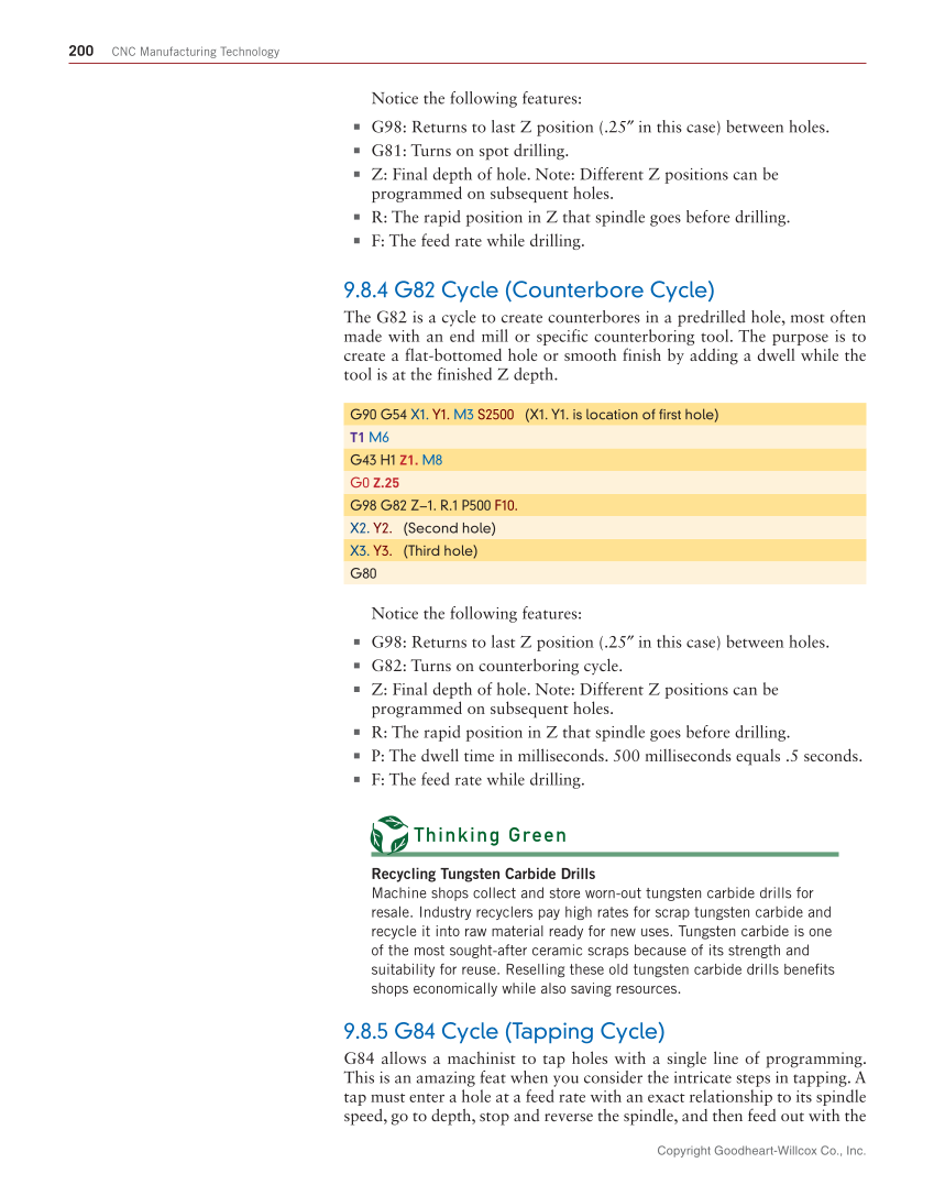Copyright Goodheart-Willcox Co., Inc. 200 CNC Manufacturing Technology Notice the following features: ■ G98: Returns to last Z position (.25″ in this case) between holes. ■ G81: Turns on spot drilling. ■ Z: Final depth of hole. Note: Different Z positions can be programmed on subsequent holes. ■ R: The rapid position in Z that spindle goes before drilling. ■ F: The feed rate while drilling. 9.8.4 G82 Cycle (Counterbore Cycle) The G82 is a cycle to create counterbores in a predrilled hole, most often made with an end mill or specific counterboring tool. The purpose is to create a flat-bottomed hole or smooth finish by adding a dwell while the tool is at the finished Z depth. G90 G54 X1. Y1. M3 S2500 (X1. Y1. is location of first hole) T1 M6 G43 H1 Z1. M8 G0 Z.25 G98 G82 Z−1. R.1 P500 F10. X2. Y2. (Second hole) X3. Y3. (Third hole) G80 Notice the following features: ■ G98: Returns to last Z position (.25″ in this case) between holes. ■ G82: Turns on counterboring cycle. ■ Z: Final depth of hole. Note: Different Z positions can be programmed on subsequent holes. ■ R: The rapid position in Z that spindle goes before drilling. ■ P: The dwell time in milliseconds. 500 milliseconds equals .5 seconds. ■ F: The feed rate while drilling. Thinking Green Recycling Tungsten Carbide Drills Machine shops collect and store worn-out tungsten carbide drills for resale. Industry recyclers pay high rates for scrap tungsten carbide and recycle it into raw material ready for new uses. Tungsten carbide is one of the most sought-after ceramic scraps because of its strength and suitability for reuse. Reselling these old tungsten carbide drills benefi ts shops economically while also saving resources. 9.8.5 G84 Cycle (Tapping Cycle) G84 allows a machinist to tap holes with a single line of programming. This is an amazing feat when you consider the intricate steps in tapping. A tap must enter a hole at a feed rate with an exact relationship to its spindle speed, go to depth, stop and reverse the spindle, and then feed out with the