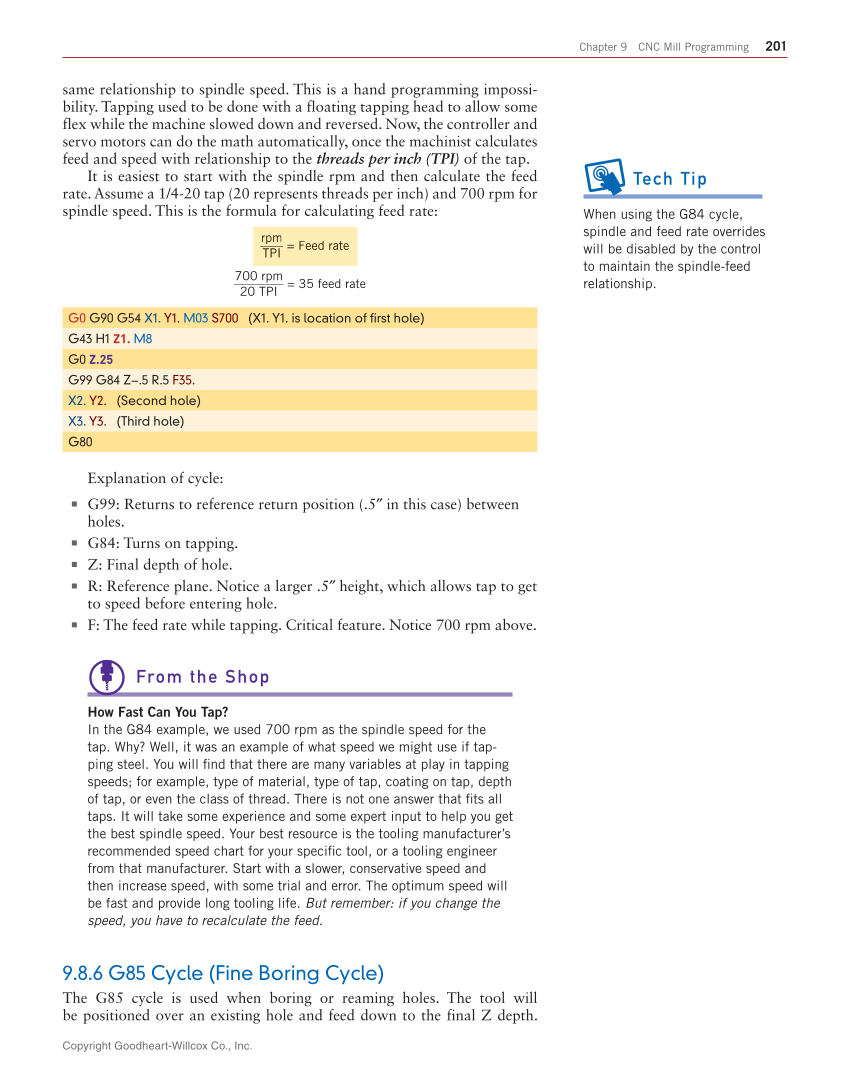 Copyright Goodheart-Willcox Co., Inc. Chapter 9 CNC Mill Programming 201 same relationship to spindle speed. This is a hand programming impossi- bility. Tapping used to be done with a floating tapping head to allow some flex while the machine slowed down and reversed. Now, the controller and servo motors can do the math automatically, once the machinist calculates feed and speed with relationship to the threads per inch (TPI) of the tap. It is easiest to start with the spindle rpm and then calculate the feed rate. Assume a 1/4-20 tap (20 represents threads per inch) and 700 rpm for spindle speed. This is the formula for calculating feed rate: rpm ____ TPI = Feed rate 700 rpm ________ 20 TPI = 35 feed rate G0 G90 G54 X1. Y1. M03 S700 (X1. Y1. is location of first hole) G43 H1 Z1. M8 G0 Z.25 G99 G84 Z−.5 R.5 F35. X2. Y2. (Second hole) X3. Y3. (Third hole) G80 Explanation of cycle: ■ G99: Returns to reference return position (.5″ in this case) between holes. ■ G84: Turns on tapping. ■ Z: Final depth of hole. ■ R: Reference plane. Notice a larger .5″ height, which allows tap to get to speed before entering hole. ■ F: The feed rate while tapping. Critical feature. Notice 700 rpm above. From the Shop How Fast Can You Tap? In the G84 example, we used 700 rpm as the spindle speed for the tap. Why? Well, it was an example of what speed we might use if tap- ping steel. You will fi nd that there are many variables at play in tapping speeds for example, type of material, type of tap, coating on tap, depth of tap, or even the class of thread. There is not one answer that fi ts all taps. It will take some experience and some expert input to help you get the best spindle speed. Your best resource is the tooling manufacturer’s recommended speed chart for your specifi c tool, or a tooling engineer from that manufacturer. Start with a slower, conservative speed and then increase speed, with some trial and error. The optimum speed will be fast and provide long tooling life. But remember: if you change the speed, you have to recalculate the feed. 9.8.6 G85 Cycle (Fine Boring Cycle) The G85 cycle is used when boring or reaming holes. The tool will be positioned over an existing hole and feed down to the final Z depth. rpm ____ TPI = Feed rate m _ Tech Tip When using the G84 cycle, spindle and feed rate overrides will be disabled by the control to maintain the spindle-feed relationship.