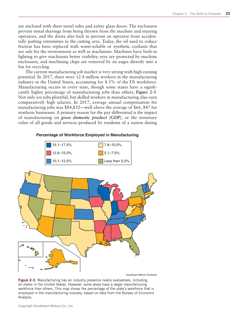 Copyright Goodheart-Willcox Co., Inc. Chapter 2 The Skills to Compete 23 are enclosed with sheet metal sides and safety glass doors. The enclosures prevent metal shavings from being thrown from the machine and injuring operators, and the doors also lock to prevent an operator from acciden- tally putting extremities in the cutting area. Today, the oil used to reduce friction has been replaced with water-soluble or synthetic coolants that are safe for the environment as well as machinists. Machines have built-in lighting to give machinists better visibility, eyes are protected by machine enclosures, and machining chips are removed by an auger directly into a bin for recycling. The current manufacturing job market is very strong with high earning potential. In 2017, there were 12.4 million workers in the manufacturing industry in the United States, accounting for 8.5% of the US workforce. Manufacturing occurs in every state, though some states have a signifi- cantly higher percentage of manufacturing jobs than others, Figure 2-3. Not only are jobs plentiful, but skilled workers in manufacturing also earn comparatively high salaries. In 2017, average annual compensation for manufacturing jobs was $84,832—well above the average of $66, 847 for nonfarm businesses. A primary reason for the pay differential is the impact of manufacturing on gross domestic product (GDP), or the monetary value of all goods and services produced by residents of a nation during OHIO Percentage of Workforce Employed in Manufacturing 15.1–17.5% 12.6–15.0% 10.1–12.5% 7.6–10.0% 5.1–7.5% Less than 5.0% Goodheart-Willcox Publisher Figure 2-3. Manufacturing has an industry presence nearly everywhere, including all states in the United States. However, some areas have a larger manufacturing workforce than others. This map shows the percentage of the state’s workforce that is employed in the manufacturing industry, based on data from the Bureau of Economic Analysis.
