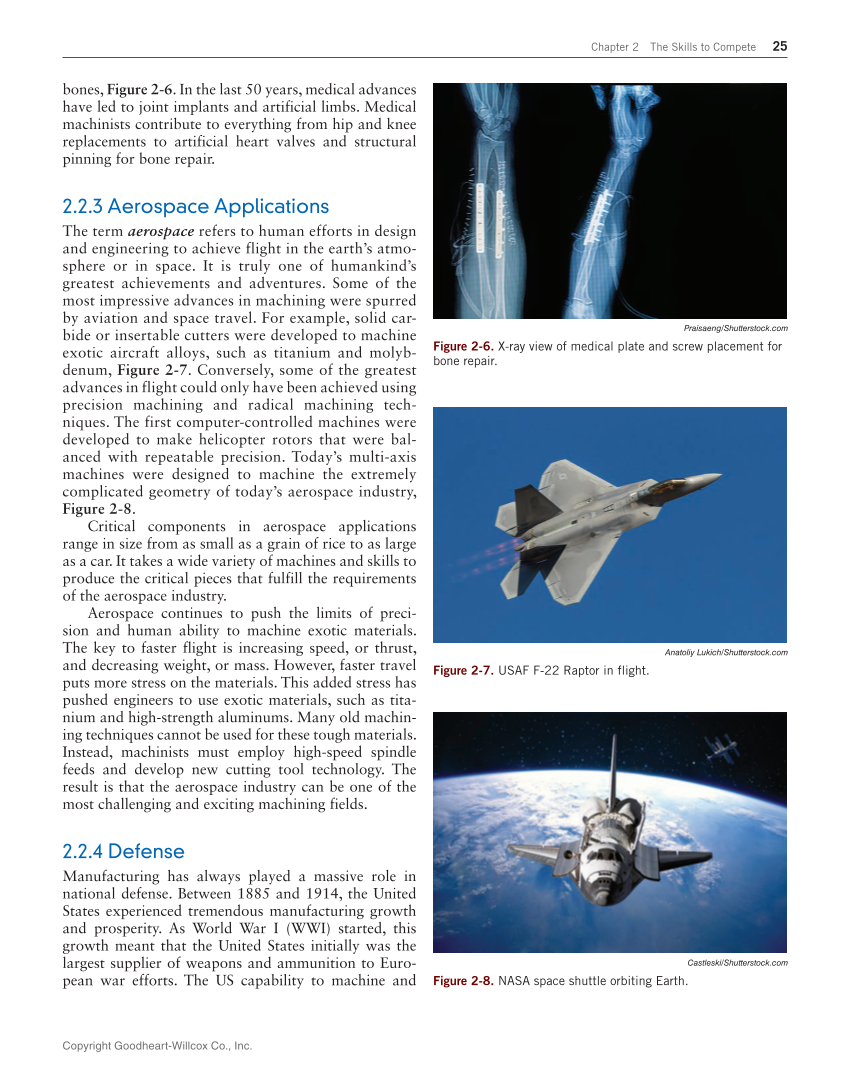 Copyright Goodheart-Willcox Co., Inc. Chapter 2 The Skills to Compete 25 bones, Figure 2-6. In the last 50 years, medical advances have led to joint implants and artificial limbs. Medical machinists contribute to everything from hip and knee replacements to artificial heart valves and structural pinning for bone repair. 2.2.3 Aerospace Applications The term aerospace refers to human efforts in design and engineering to achieve flight in the earth’s atmo- sphere or in space. It is truly one of humankind’s greatest achievements and adventures. Some of the most impressive advances in machining were spurred by aviation and space travel. For example, solid car- bide or insertable cutters were developed to machine exotic aircraft alloys, such as titanium and molyb- denum, Figure 2-7. Conversely, some of the greatest advances in flight could only have been achieved using precision machining and radical machining tech- niques. The first computer-controlled machines were developed to make helicopter rotors that were bal- anced with repeatable precision. Today’s multi-axis machines were designed to machine the extremely complicated geometry of today’s aerospace industry, Figure 2-8. Critical components in aerospace applications range in size from as small as a grain of rice to as large as a car. It takes a wide variety of machines and skills to produce the critical pieces that fulfill the requirements of the aerospace industry. Aerospace continues to push the limits of preci- sion and human ability to machine exotic materials. The key to faster flight is increasing speed, or thrust, and decreasing weight, or mass. However, faster travel puts more stress on the materials. This added stress has pushed engineers to use exotic materials, such as tita- nium and high-strength aluminums. Many old machin- ing techniques cannot be used for these tough materials. Instead, machinists must employ high-speed spindle feeds and develop new cutting tool technology. The result is that the aerospace industry can be one of the most challenging and exciting machining fields. 2.2.4 Defense Manufacturing has always played a massive role in national defense. Between 1885 and 1914, the United States experienced tremendous manufacturing growth and prosperity. As World War I (WWI) started, this growth meant that the United States initially was the largest supplier of weapons and ammunition to Euro- pean war efforts. The US capability to machine and Praisaeng/Shutterstock.com Figure 2-6. X-ray view of medical plate and screw placement for bone repair. Anatoliy Lukich/Shutterstock.com Figure 2-7. USAF F-22 Raptor in flight. Castleski/Shutterstock.com Figure 2-8. NASA space shuttle orbiting Earth.