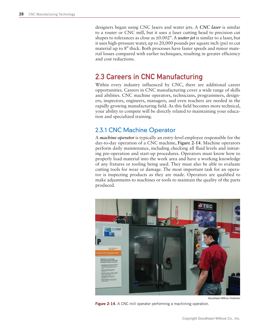 Copyright Goodheart-Willcox Co., Inc. 28 CNC Manufacturing Technology designers began using CNC lasers and water jets. A CNC laser is similar to a router or CNC mill, but it uses a laser cutting head to precision cut shapes to tolerances as close as ±0.002″. A water jet is similar to a laser, but it uses high-pressure water, up to 20,000 pounds per square inch (psi) to cut material up to 8″ thick. Both processes have faster speeds and minor mate- rial losses compared with earlier techniques, resulting in greater efficiency and cost reductions. 2.3 Careers in CNC Manufacturing Within every industry influenced by CNC, there are additional career opportunities. Careers in CNC manufacturing cover a wide range of skills and abilities. CNC machine operators, technicians, programmers, design- ers, inspectors, engineers, managers, and even teachers are needed in the rapidly growing manufacturing field. As this field becomes more technical, your ability to compete will be directly related to maintaining your educa- tion and specialized training. 2.3.1 CNC Machine Operator A machine operator is typically an entry-level employee responsible for the day-to-day operation of a CNC machine, Figure 2-14. Machine operators perform daily maintenance, including checking all fluid levels and initiat- ing pre-operation and start-up procedures. Operators must know how to properly load material into the work area and have a working knowledge of any fixtures or tooling being used. They must also be able to evaluate cutting tools for wear or damage. The most important task for an opera- tor is inspecting products as they are made. Operators are qualified to make adjustments to machines or tools to maintain the quality of the parts produced. Goodheart-Willcox Publisher Figure 2-14. A CNC mill operator performing a machining operation.
