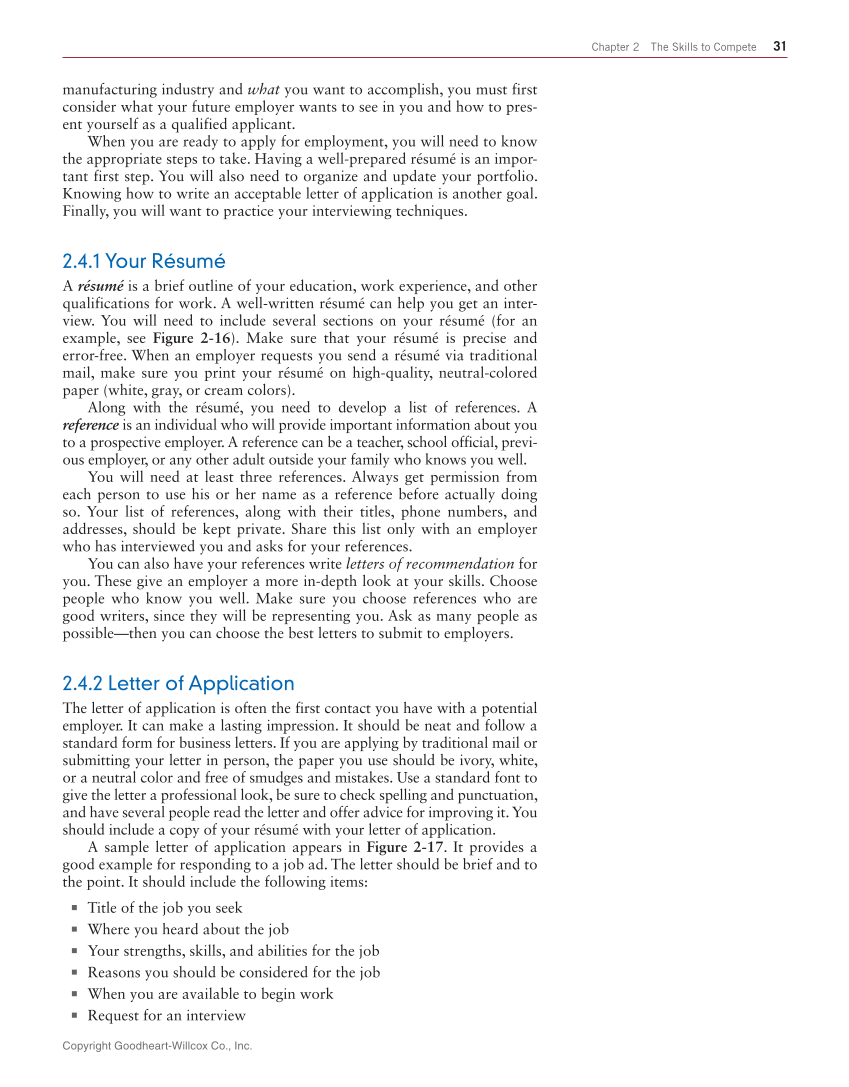 Copyright Goodheart-Willcox Co., Inc. Chapter 2 The Skills to Compete 31 manufacturing industry and what you want to accomplish, you must first consider what your future employer wants to see in you and how to pres- ent yourself as a qualified applicant. When you are ready to apply for employment, you will need to know the appropriate steps to take. Having a well-prepared résumé is an impor- tant first step. You will also need to organize and update your portfolio. Knowing how to write an acceptable letter of application is another goal. Finally, you will want to practice your interviewing techniques. 2.4.1 Your Résumé A résumé is a brief outline of your education, work experience, and other qualifications for work. A well-written résumé can help you get an inter- view. You will need to include several sections on your résumé (for an example, see Figure 2-16). Make sure that your résumé is precise and error-free. When an employer requests you send a résumé via traditional mail, make sure you print your résumé on high-quality, neutral-colored paper (white, gray, or cream colors). Along with the résumé, you need to develop a list of references. A reference is an individual who will provide important information about you to a prospective employer. A reference can be a teacher, school official, previ- ous employer, or any other adult outside your family who knows you well. You will need at least three references. Always get permission from each person to use his or her name as a reference before actually doing so. Your list of references, along with their titles, phone numbers, and addresses, should be kept private. Share this list only with an employer who has interviewed you and asks for your references. You can also have your references write letters of recommendation for you. These give an employer a more in-depth look at your skills. Choose people who know you well. Make sure you choose references who are good writers, since they will be representing you. Ask as many people as possible—then you can choose the best letters to submit to employers. 2.4.2 Letter of Application The letter of application is often the first contact you have with a potential employer. It can make a lasting impression. It should be neat and follow a standard form for business letters. If you are applying by traditional mail or submitting your letter in person, the paper you use should be ivory, white, or a neutral color and free of smudges and mistakes. Use a standard font to give the letter a professional look, be sure to check spelling and punctuation, and have several people read the letter and offer advice for improving it. You should include a copy of your résumé with your letter of application. A sample letter of application appears in Figure 2-17. It provides a good example for responding to a job ad. The letter should be brief and to the point. It should include the following items: ■ Title of the job you seek ■ Where you heard about the job ■ Your strengths, skills, and abilities for the job ■ Reasons you should be considered for the job ■ When you are available to begin work ■ Request for an interview