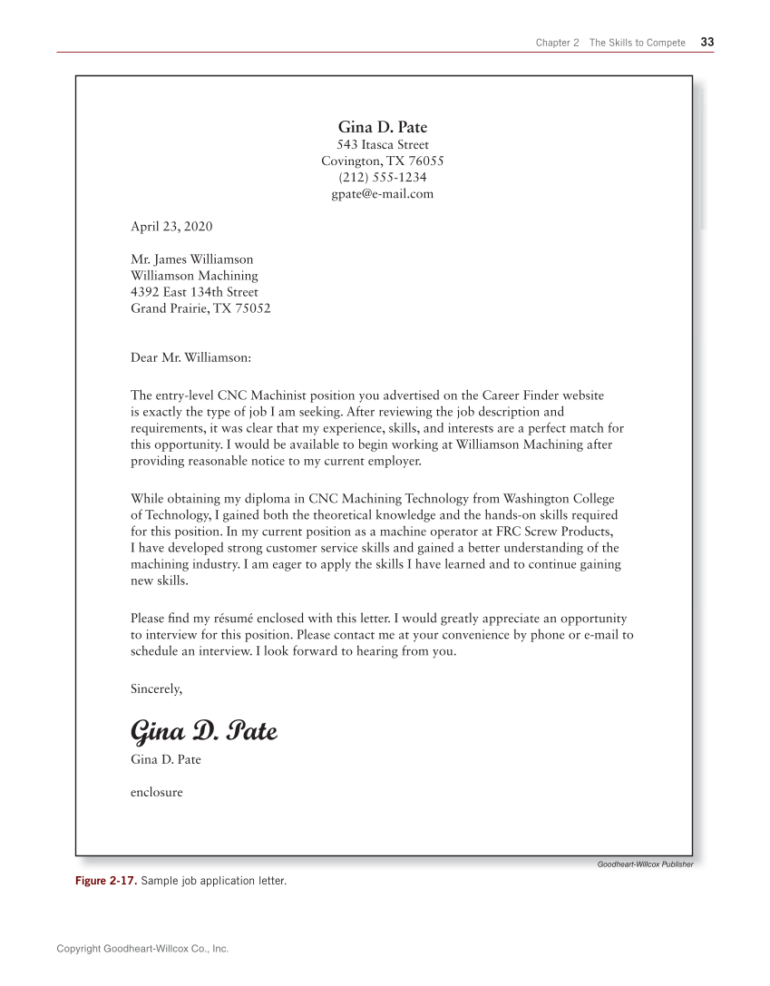 Copyright Goodheart-Willcox Co., Inc. Chapter 2 The Skills to Compete 33 Goodheart-Willcox Publisherher Figure 2-17. Sample job application letter. G oodheart-Willcox Publis Gina D. Pate 543 Itasca Street Covington, TX 76055 (212) 555-1234 gpate@e-mail.com April 23, 2020 Mr. James Williamson Williamson Machining 4392 East 134th Street Grand Prairie, TX 75052 Dear Mr. Williamson: The entry-level CNC Machinist position you advertised on the Career Finder website is exactly the type of job I am seeking. After reviewing the job description and requirements, it was clear that my experience, skills, and interests are a perfect match for this opportunity. I would be available to begin working at Williamson Machining after providing reasonable notice to my current employer. While obtaining my diploma in CNC Machining Technology from Washington College of Technology, I gained both the theoretical knowledge and the hands-on skills required for this position. In my current position as a machine operator at FRC Screw Products, I have developed strong customer service skills and gained a better understanding of the machining industry. I am eager to apply the skills I have learned and to continue gaining new skills. Please fi nd my résumé enclosed with this letter. I would greatly appreciate an opportunity to interview for this position. Please contact me at your convenience by phone or e-mail to schedule an interview. I look forward to hearing from you. Sincerely, Gina D. Pate Gina D. Pate enclosure