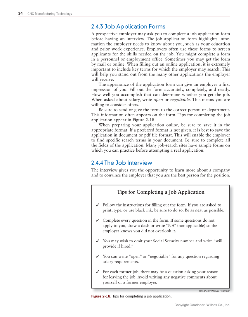 Copyright Goodheart-Willcox Co., Inc. 34 CNC Manufacturing Technology 2.4.3 Job Application Forms A prospective employer may ask you to complete a job application form before having an interview. The job application form highlights infor- mation the employer needs to know about you, such as your education and prior work experience. Employers often use these forms to screen applicants for the skills needed on the job. You might complete a form in a personnel or employment office. Sometimes you may get the form by mail or online. When filling out an online application, it is extremely important to include key terms for which the employer may search. This will help you stand out from the many other applications the employer will receive. The appearance of the application form can give an employer a first impression of you. Fill out the form accurately, completely, and neatly. How well you accomplish that can determine whether you get the job. When asked about salary, write open or negotiable. This means you are willing to consider offers. Be sure to send or give the form to the correct person or department. This information often appears on the form. Tips for completing the job application appear in Figure 2-18. When preparing your application online, be sure to save it in the appropriate format. If a preferred format is not given, it is best to save the application in document or pdf file format. This will enable the employer to find specific search terms in your document. Be sure to complete all the fields of the application. Many job-search sites have sample forms on which you can practice before attempting a real application. 2.4.4 The Job Interview The interview gives you the opportunity to learn more about a company and to convince the employer that you are the best person for the position. Goodheart-Willcox Publisherr Figure 2-18. Tips for completing a job application. Goodheart-Willcox Publishe Tips for Completing a Job Application ✓ Follow the instructions for fi lling out the form. If you are asked to print, type, or use black ink, be sure to do so. Be as neat as possible. ✓ Complete every question in the form. If some questions do not apply to you, draw a dash or write “NA” (not applicable) so the employer knows you did not overlook it. ✓ You may wish to omit your Social Security number and write “will provide if hired.” ✓ You can write “open” or “negotiable” for any question regarding salary requirements. ✓ For each former job, there may be a question asking your reason for leaving the job. Avoid writing any negative comments about yourself or a former employer.