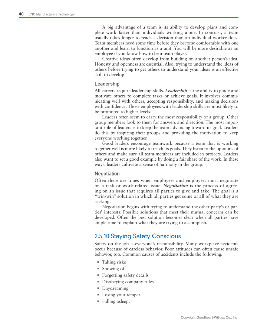 Copyright Goodheart-Willcox Co., Inc. 40 CNC Manufacturing Technology A big advantage of a team is its ability to develop plans and com- plete work faster than individuals working alone. In contrast, a team usually takes longer to reach a decision than an individual worker does. Team members need some time before they become comfortable with one another and learn to function as a unit. You will be more desirable as an employee if you know how to be a team player. Creative ideas often develop from building on another person’s idea. Honesty and openness are essential. Also, trying to understand the ideas of others before trying to get others to understand your ideas is an effective skill to develop. Leadership All careers require leadership skills. Leadership is the ability to guide and motivate others to complete tasks or achieve goals. It involves commu- nicating well with others, accepting responsibility, and making decisions with confidence. Those employees with leadership skills are most likely to be promoted to higher levels. Leaders often seem to carry the most responsibility of a group. Other group members look to them for answers and direction. The most impor- tant role of leaders is to keep the team advancing toward its goal. Leaders do this by inspiring their groups and providing the motivation to keep everyone working together. Good leaders encourage teamwork because a team that is working together well is more likely to reach its goals. They listen to the opinions of others and make sure all team members are included in projects. Leaders also want to set a good example by doing a fair share of the work. In these ways, leaders cultivate a sense of harmony in the group. Negotiation Often there are times when employees and employers must negotiate on a task or work-related issue. Negotiation is the process of agree- ing on an issue that requires all parties to give and take. The goal is a “win-win” solution in which all parties get some or all of what they are seeking. Negotiation begins with trying to understand the other party’s or par- ties’ interests. Possible solutions that meet their mutual concerns can be developed. Often the best solution becomes clear when all parties have ample time to explain what they are trying to accomplish. 2.5.10 Staying Safety Conscious Safety on the job is everyone’s responsibility. Many workplace accidents occur because of careless behavior. Poor attitudes can often cause unsafe behavior, too. Common causes of accidents include the following: ■ Taking risks ■ Showing off ■ Forgetting safety details ■ Disobeying company rules ■ Daydreaming ■ Losing your temper ■ Falling asleep.