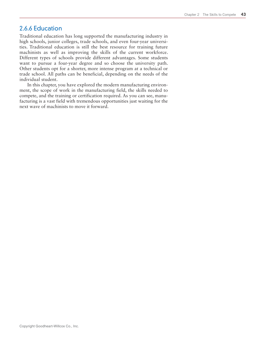 Copyright Goodheart-Willcox Co., Inc. Chapter 2 The Skills to Compete 43 2.6.6 Education Traditional education has long supported the manufacturing industry in high schools, junior colleges, trade schools, and even four-year universi- ties. Traditional education is still the best resource for training future machinists as well as improving the skills of the current workforce. Different types of schools provide different advantages. Some students want to pursue a four-year degree and so choose the university path. Other students opt for a shorter, more intense program at a technical or trade school. All paths can be beneficial, depending on the needs of the individual student. In this chapter, you have explored the modern manufacturing environ- ment, the scope of work in the manufacturing field, the skills needed to compete, and the training or certification required. As you can see, manu- facturing is a vast field with tremendous opportunities just waiting for the next wave of machinists to move it forward.