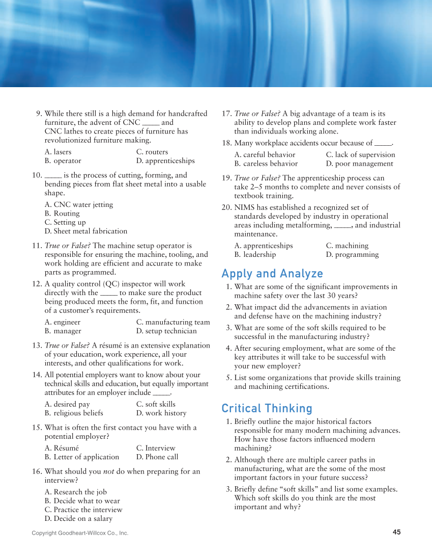 Copyright Goodheart-Willcox Co., Inc. 45 9. While there still is a high demand for handcrafted furniture, the advent of CNC _____ and CNC lathes to create pieces of furniture has revolutionized furniture making. A. lasers B. operator C. routers D. apprenticeships 10. _____ is the process of cutting, forming, and bending pieces from flat sheet metal into a usable shape. A. CNC water jetting B. Routing C. Setting up D. Sheet metal fabrication 11. True or False? The machine setup operator is responsible for ensuring the machine, tooling, and work holding are efficient and accurate to make parts as programmed. 12. A quality control (QC) inspector will work directly with the _____ to make sure the product being produced meets the form, fit, and function of a customer’s requirements. A. engineer B. manager C. manufacturing team D. setup technician 13. True or False? A résumé is an extensive explanation of your education, work experience, all your interests, and other qualifications for work. 14. All potential employers want to know about your technical skills and education, but equally important attributes for an employer include _____. A. desired pay B. religious beliefs C. soft skills D. work history 15. What is often the first contact you have with a potential employer? A. Résumé B. Letter of application C. Interview D. Phone call 16. What should you not do when preparing for an interview? A. Research the job B. Decide what to wear C. Practice the interview D. Decide on a salary 17. True or False? A big advantage of a team is its ability to develop plans and complete work faster than individuals working alone. 18. Many workplace accidents occur because of _____. A. careful behavior B. careless behavior C. lack of supervision D. poor management 19. True or False? The apprenticeship process can take 2–5 months to complete and never consists of textbook training. 20. NIMS has established a recognized set of standards developed by industry in operational areas including metalforming, _____, and industrial maintenance. A. apprenticeships B. leadership C. machining D. programming Apply and Analyze 1. What are some of the significant improvements in machine safety over the last 30 years? 2. What impact did the advancements in aviation and defense have on the machining industry? 3. What are some of the soft skills required to be successful in the manufacturing industry? 4. After securing employment, what are some of the key attributes it will take to be successful with your new employer? 5. List some organizations that provide skills training and machining certifications. Critical Thinking 1. Briefly outline the major historical factors responsible for many modern machining advances. How have those factors influenced modern machining? 2. Although there are multiple career paths in manufacturing, what are the some of the most important factors in your future success? 3. Briefly define “soft skills” and list some examples. Which soft skills do you think are the most important and why?