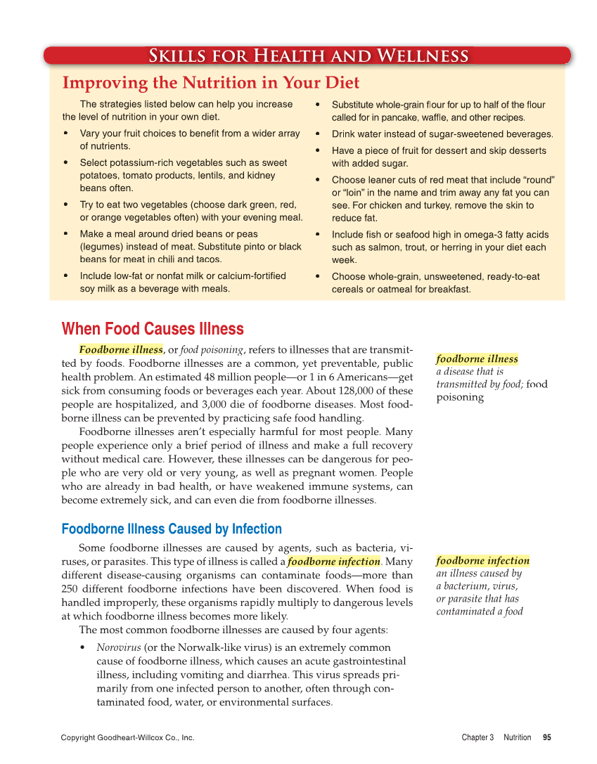 Copyright Goodheart-Willcox Co., Inc. Chapter 3 Nutrition 95 When Food Causes Illness Foodborne F illness, or food poisoning, refers to illnesses that are transmit- ted by foods. Foodborne illnesses are a common, yet preventable, public health problem. An estimated 48 million people—or 1 in 6 Americans—get sick from consuming foods or beverages each year. About 128,000 of these people are hospitalized, and 3,000 die of foodborne diseases. Most food- borne illness can be prevented by practicing safe food handling. Foodborne illnesses aren’t especially harmful for most people. Many people experience only a brief period of illness and make a full recovery without medical care. However, these illnesses can be dangerous for peo- ple who are very old or very young, as well as pregnant women. People who are already in bad health, or have weakened immune systems, can become extremely sick, and can even die from foodborne illnesses. Foodborne Illness Caused by Infection Some foodborne illnesses are caused by agents, such as bacteria, vi- ruses, or parasites. This type of illness is called a foodborne infection. foodborne infection Many different disease-causing organisms can contaminate foods—more than 250 different foodborne infections have been discovered. When food is handled improperly, these organisms rapidly multiply to dangerous levels at which foodborne illness becomes more likely. The most common foodborne illnesses are caused by four agents: • Norovirus (or the Norwalk-like virus) is an extremely common cause of foodborne illness, which causes an acute gastrointestinal illness, including vomiting and diarrhea. This virus spreads pri- marily from one infected person to another, often through con- taminated food, water, or environmental surfaces. Skills for Health and Wellness Improving the Nutrition in Your Diet • Substitute whole-grain flour for up to half of the flour fl fl called for in pancake, waffl and other recipes. fle, • Drink water instead of sugar-sweetened beverages. • Have a piece of fruit for dessert and skip desserts with added sugar. • Choose leaner cuts of red meat that include “round” or “loin” in the name and trim away any fat you can see. For chicken and turkey, remove the skin to reduce fat. • Include fi sh or seafood high in omega-3 fatty acids such as salmon, trout, or herring in your diet each week. • Choose whole-grain, unsweetened, ready-to-eat cereals or oatmeal for breakfast. The strategies listed below can help you increase the level of nutrition in your own diet. • Vary your fruit choices to benefi t from a wider array of nutrients. • Select potassium-rich vegetables such as sweet potatoes, tomato products, lentils, and kidney beans often. • Try to eat two vegetables (choose dark green, red, or orange vegetables often) with your evening meal. • Make a meal around dried beans or peas (legumes) instead of meat. Substitute pinto or black beans for meat in chili and tacos. • Include low-fat or nonfat milk or calcium-fortified soy milk as a beverage with meals. foodborne f illness a disease that is transmitted by food food poisoning foodborne f infection an illness caused by a bacterium, virus, or parasite that has contaminated a food