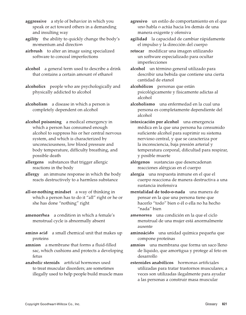 Copyright Goodheart-Willcox Co., Inc. Glossary 821 aggressive a style of behavior in which you speak or act toward others in a demanding and insulting way agility the ability to quickly change the body’s momentum and direction airbrush to alter an image using specialized software to conceal imperfections alcohol a general term used to describe a drink that contains a certain amount of ethanol alcoholics people who are psychologically and physically addicted to alcohol alcoholism a disease in which a person is completely dependent on alcohol alcohol poisoning a medical emergency in which a person has consumed enough alcohol to suppress his or her central nervous system, and which is characterized by unconsciousness, low blood pressure and body temperature, diffi breathing, and ficulty possible death allergens substances that trigger allergic reactions in the body allergy an immune response in which the body reacts destructively to a harmless substance all-or-nothing mindset a way of thinking in which a person has to do it “all” right or he or she has done “nothing” right amenorrhea a condition in which a female’s menstrual cycle is abnormally absent amino acid a small chemical unit that makes up proteins amnion a membrane that forms a fluid-filled fl fi sac, which cushions and protects a developing fetus anabolic steroids artifi hormones used ficial to treat muscular disorders are sometimes illegally used to help people build muscle mass agresivo un estilo de comportamiento en el que uno habla o actúa hacia los demás de una manera exigente y ofensiva agilidad la capacidad de cambiar rápidamente el impulso y la dirección del cuerpo retocar modifi una imagen utilizando ficar un software especializado para ocultar imperfecciones alcohol un término general utilizado para describir una bebida que contiene una cierta cantidad de etanol alcohólicos personas que están psicológicamente y físicamente adictas al alcohol alcoholismo una enfermedad en la cual una persona es completamente dependiente del alcohol intoxicación por alcohol una emergencia médica en la que una persona ha consumido sufi alcohol para suprimir su sistema ficiente nervioso central, y que se caracteriza por la inconsciencia, baja presión arterial y temperatura corporal, difi para respirar, ficultad y posible muerte alérgenos sustancias que desencadenan reacciones alérgicas en el cuerpo alergia una respuesta inmune en el que el cuerpo reacciona de manera destructiva a una sustancia inofensiva mentalidad de todo-o-nada una manera de pensar en la que una persona tiene que hacerlo “todo” bien o él o ella no ha hecho “nada” bien amenorrea una condición en la que el ciclo menstrual de una mujer está anormalmente ausente aminoácido una unidad química pequeña que compone proteínas amnios una membrana que forma un saco lleno de líquido, que amortigua y protege al feto en desarrollo esteroides anabólicos hormonas artificialesfi utilizadas para tratar trastornos musculares a veces son utilizadas ilegalmente para ayudar a las personas a construir masa muscular