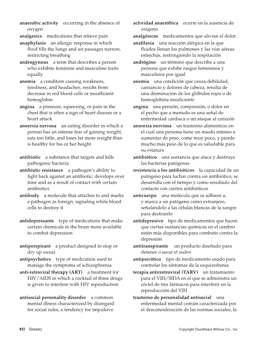 822 Glossary Copyright Goodheart-Willcox Co., Inc. anaerobic activity occurring in the absence of oxygen analgesics medications that relieve pain anaphylaxis an allergic response in which fl uid fills fl the lungs and air passages narrow, fi restricting breathing androgynous a term that describes a person who exhibits feminine and masculine traits equally anemia a condition causing weakness, tiredness, and headaches results from decrease in red blood cells or insufficient fi hemoglobin angina a pressure, squeezing, or pain in the chest that is often a sign of heart disease or a heart attack anorexia nervosa an eating disorder in which a person has an intense fear of gaining weight, eats too little, and loses far more weight than is healthy for his or her height antibiotic a substance that targets and kills pathogenic bacteria antibiotic resistance a pathogen’s ability to fi ght back against an antibiotic develops over fi time and as a result of contact with certain antibiotics antibody a molecule that attaches to and marks a pathogen as foreign, signaling white blood cells to destroy it antidepressants type of medications that make certain chemicals in the brain more available to combat depression antiperspirant a product designed to stop or dry up sweat antipsychotics type of medication used to manage the symptoms of schizophrenia anti-retroviral therapy (ART) a treatment for HIV/AIDS in which a cocktail of three drugs is given to interfere with HIV reproduction antisocial personality disorder a common r mental illness characterized by disregard for social rules, a tendency for impulsive actividad anaeróbica ocurre en la ausencia de oxígeno analgésicos medicamentos que alivian el dolor anafi filaxia una reacción alérgica en la que fl uidos llenan los pulmones y las vías aéreas fl estrechas, restringiendo la respiración andrógino un término que describe a una persona que exhibe rasgos femeninos y masculinos por igual anemia una condición que causa debilidad, cansancio y dolores de cabeza resulta de una disminución de los glóbulos rojos o de hemoglobina insuficientefi angina una presión, compresión, o dolor en el pecho que a menudo es una señal de enfermedad cardiaca o un ataque al corazón anorexia nerviosa un trastorno alimenticio en el cual una persona tiene un miedo intenso a aumentar de peso, come muy poco, y pierde mucho más peso de lo que es saludable para su estatura antibiótico una sustancia que ataca y destruye las bacterias patógenas resistencia a los antibióticos la capacidad de un patógeno para luchar contra un antibiótico se desarrolla con el tiempo y como resultado del contacto con ciertos antibióticos anticuerpo una molécula que se adhiere a, y marca a un patógeno como extranjero, señalándolo a las células blancas de la sangre para destruirlo antidepresivo tipo de medicamentos que hacen que ciertas sustancias químicas en el cerebro estén más disponibles para combatir contra la depresión antitranspirante un producto diseñado para detener o secar el sudor antipsicótico tipo de medicamento usado para controlar los síntomas de la esquizofrenia terapia antirretroviral (TARV) un tratamiento para el VIH/SIDA en el que se administra un cóctel de tres fármacos para interferir en la reproducción del VIH trastorno de personalidad antisocial una enfermedad mental común caracterizada por el desconsideración de las normas sociales, la