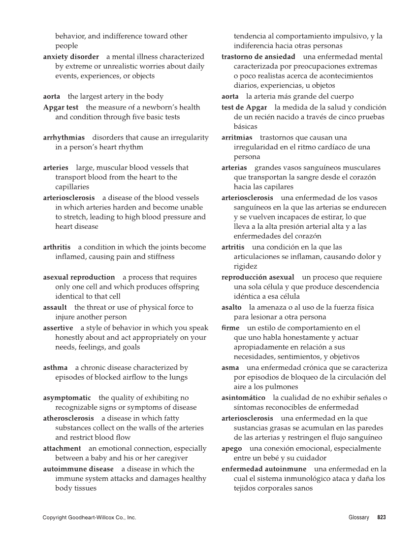 Copyright Goodheart-Willcox Co., Inc. Glossary 823 behavior, and indifference toward other people anxiety disorder a mental illness characterized r by extreme or unrealistic worries about daily events, experiences, or objects aorta the largest artery in the body Apgar test the measure of a newborn’s health and condition through five basic tests fi arrhythmias disorders that cause an irregularity in a person’s heart rhythm arteries large, muscular blood vessels that transport blood from the heart to the capillaries arteriosclerosis a disease of the blood vessels in which arteries harden and become unable to stretch, leading to high blood pressure and heart disease arthritis a condition in which the joints become inflamed, causing pain and stiffness fl asexual reproduction a process that requires only one cell and which produces offspring identical to that cell assault the threat or use of physical force to injure another person assertive a style of behavior in which you speak honestly about and act appropriately on your needs, feelings, and goals asthma a chronic disease characterized by episodes of blocked airfl to the lungs flow asymptomatic the quality of exhibiting no recognizable signs or symptoms of disease atherosclerosis a disease in which fatty substances collect on the walls of the arteries and restrict blood fl ow fl attachment an emotional connection, especially between a baby and his or her caregiver autoimmune disease a disease in which the immune system attacks and damages healthy body tissues tendencia al comportamiento impulsivo, y la indiferencia hacia otras personas trastorno de ansiedad una enfermedad mental caracterizada por preocupaciones extremas o poco realistas acerca de acontecimientos diarios, experiencias, u objetos aorta la arteria más grande del cuerpo test de Apgar la medida de la salud y condición de un recién nacido a través de cinco pruebas básicas arritmias trastornos que causan una irregularidad en el ritmo cardíaco de una persona arterias grandes vasos sanguíneos musculares que transportan la sangre desde el corazón hacia las capilares arteriosclerosis una enfermedad de los vasos sanguíneos en la que las arterias se endurecen y se vuelven incapaces de estirar, lo que lleva a la alta presión arterial alta y a las enfermedades del corazón artritis una condición en la que las articulaciones se infl causando dolor y flaman, rigidez reproducción asexual un proceso que requiere una sola célula y que produce descendencia idéntica a esa célula asalto la amenaza o al uso de la fuerza física para lesionar a otra persona fi rme fi un estilo de comportamiento en el que uno habla honestamente y actuar apropiadamente en relación a sus necesidades, sentimientos, y objetivos asma una enfermedad crónica que se caracteriza por episodios de bloqueo de la circulación del aire a los pulmones asintomático la cualidad de no exhibir señales o síntomas reconocibles de enfermedad arteriosclerosis una enfermedad en la que sustancias grasas se acumulan en las paredes de las arterias y restringen el fl ujo sanguíneo fl apego una conexión emocional, especialmente entre un bebé y su cuidador enfermedad autoinmune una enfermedad en la cual el sistema inmunológico ataca y daña los tejidos corporales sanos