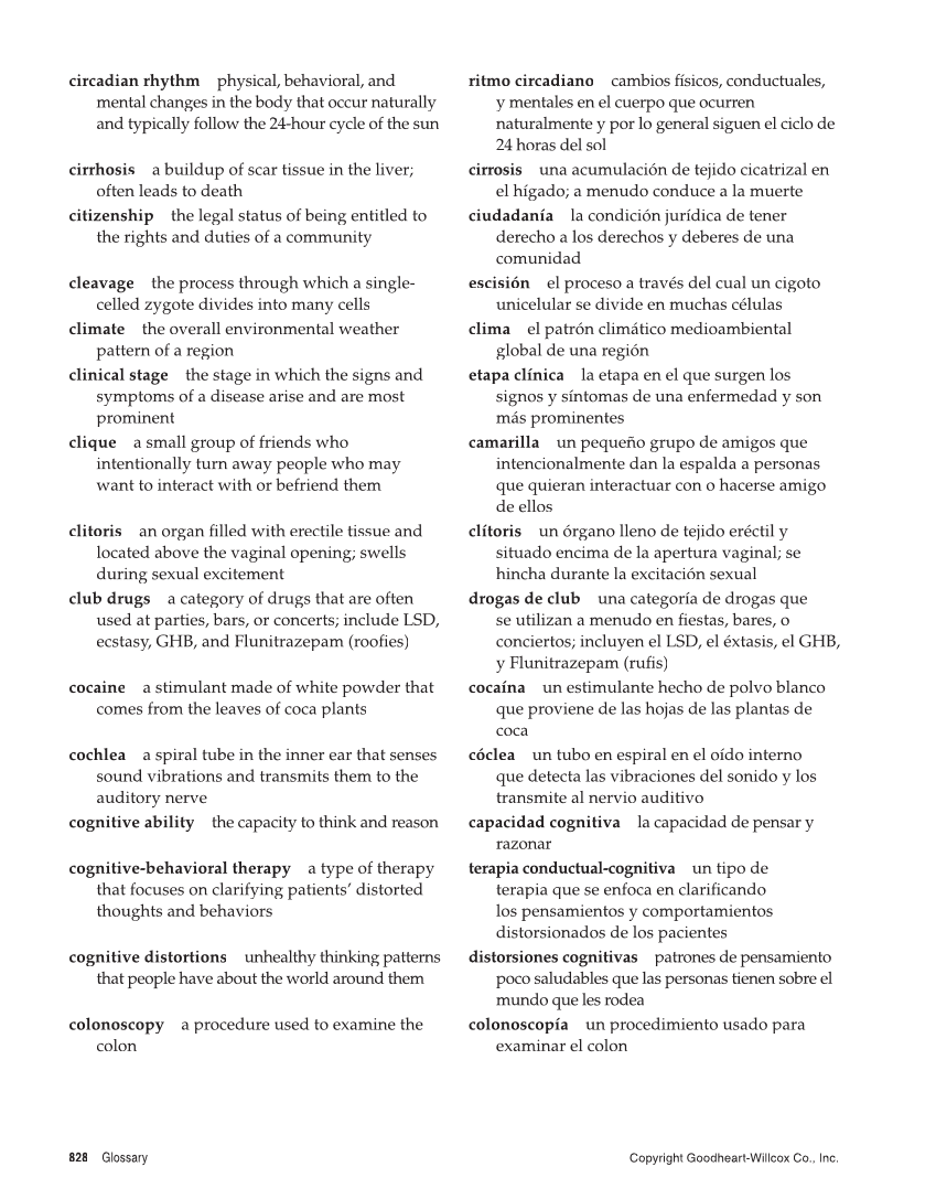 828 Glossary Copyright Goodheart-Willcox Co., Inc. circadian rhythm physical, behavioral, and mental changes in the body that occur naturally and typically follow the 24-hour cycle of the sun cirrhosis a buildup of scar tissue in the liver often leads to death citizenship the legal status of being entitled to the rights and duties of a community cleavage the process through which a single- celled zygote divides into many cells climate the overall environmental weather pattern of a region clinical stage the stage in which the signs and symptoms of a disease arise and are most prominent clique a small group of friends who intentionally turn away people who may want to interact with or befriend them clitoris an organ filled with erectile tissue and fi located above the vaginal opening swells during sexual excitement club drugs a category of drugs that are often used at parties, bars, or concerts include LSD, ecstasy, GHB, and Flunitrazepam (roofies) fi cocaine a stimulant made of white powder that comes from the leaves of coca plants cochlea a spiral tube in the inner ear that senses sound vibrations and transmits them to the auditory nerve cognitive ability the capacity to think and reason cognitive-behavioral therapy a type of therapy that focuses on clarifying patients’ distorted thoughts and behaviors cognitive distortions unhealthy thinking patterns that people have about the world around them colonoscopy a procedure used to examine the colon ritmo circadiano cambios físicos, conductuales, y mentales en el cuerpo que ocurren naturalmente y por lo general siguen el ciclo de 24 horas del sol cirrosis una acumulación de tejido cicatrizal en el hígado a menudo conduce a la muerte ciudadanía la condición jurídica de tener derecho a los derechos y deberes de una comunidad escisión el proceso a través del cual un cigoto unicelular se divide en muchas células clima el patrón climático medioambiental global de una región etapa clínica la etapa en el que surgen los signos y síntomas de una enfermedad y son más prominentes camarilla un pequeño grupo de amigos que intencionalmente dan la espalda a personas que quieran interactuar con o hacerse amigo de ellos clítoris un órgano lleno de tejido eréctil y situado encima de la apertura vaginal se hincha durante la excitación sexual drogas de club una categoría de drogas que se utilizan a menudo en fi estas, bares, o fi conciertos incluyen el LSD, el éxtasis, el GHB, y Flunitrazepam (rufis)fi cocaína un estimulante hecho de polvo blanco que proviene de las hojas de las plantas de coca cóclea un tubo en espiral en el oído interno que detecta las vibraciones del sonido y los transmite al nervio auditivo capacidad cognitiva la capacidad de pensar y razonar terapia conductual-cognitiva un tipo de a terapia que se enfoca en clarificandofi los pensamientos y comportamientos distorsionados de los pacientes distorsiones cognitivas patrones de pensamiento poco saludables que las personas tienen sobre el mundo que les rodea colonoscopía un procedimiento usado para examinar el colon