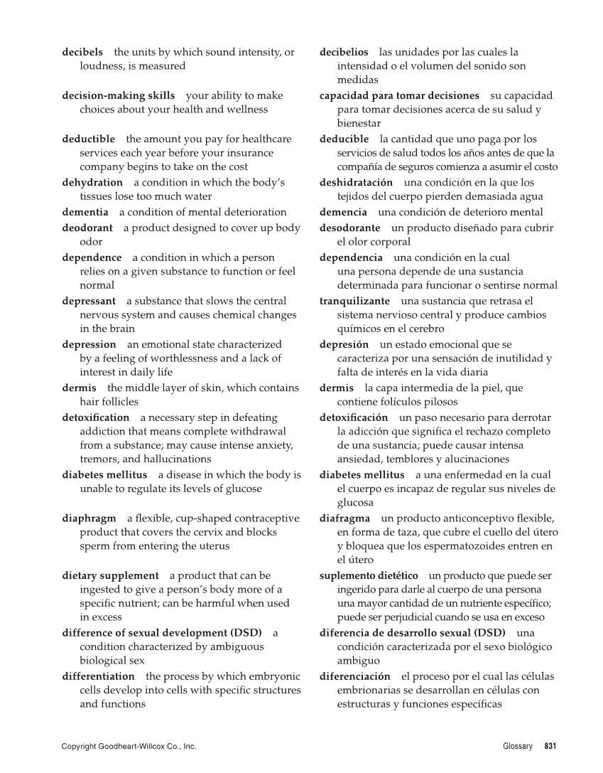 Copyright Goodheart-Willcox Co., Inc. Glossary 831 decibels the units by which sound intensity, or loudness, is measured decision-making skills your ability to make choices about your health and wellness deductible the amount you pay for healthcare services each year before your insurance company begins to take on the cost dehydration a condition in which the body’s tissues lose too much water dementia a condition of mental deterioration deodorant a product designed to cover up body odor dependence a condition in which a person relies on a given substance to function or feel normal depressant a substance that slows the central nervous system and causes chemical changes in the brain depression an emotional state characterized by a feeling of worthlessness and a lack of interest in daily life dermis the middle layer of skin, which contains hair follicles detoxifi cation a necessary step in defeating addiction that means complete withdrawal from a substance may cause intense anxiety, tremors, and hallucinations diabetes mellitus a disease in which the body is unable to regulate its levels of glucose diaphragm a fl exible, cup-shaped contraceptive product that covers the cervix and blocks sperm from entering the uterus dietary supplement a product that can be ingested to give a person’s body more of a specifi c nutrient can be harmful when used in excess difference of sexual development (DSD) a condition characterized by ambiguous biological sex differentiation the process by which embryonic cells develop into cells with specifi c structures and functions decibelios las unidades por las cuales la intensidad o el volumen del sonido son medidas capacidad para tomar decisiones su capacidad para tomar decisiones acerca de su salud y bienestar deducible la cantidad que uno paga por los servicios de salud todos los años antes de que la compañía de seguros comienza a asumir el costo deshidratación una condición en la que los tejidos del cuerpo pierden demasiada agua demencia una condición de deterioro mental desodorante un producto diseñado para cubrir el olor corporal dependencia una condición en la cual una persona depende de una sustancia determinada para funcionar o sentirse normal tranquilizante una sustancia que retrasa el sistema nervioso central y produce cambios químicos en el cerebro depresión un estado emocional que se caracteriza por una sensación de inutilidad y falta de interés en la vida diaria dermis la capa intermedia de la piel, que contiene folículos pilosos detoxifi cación un paso necesario para derrotar la adicción que signifi ca el rechazo completo de una sustancia puede causar intensa ansiedad, temblores y alucinaciones diabetes mellitus a una enfermedad en la cual el cuerpo es incapaz de regular sus niveles de glucosa diafragma un producto anticonceptivo fl exible, en forma de taza, que cubre el cuello del útero y bloquea que los espermatozoides entren en el útero suplemento dietético un producto que puede ser ingerido para darle al cuerpo de una persona una mayor cantidad de un nutriente específi co puede ser perjudicial cuando se usa en exceso diferencia de desarrollo sexual (DSD) una condición caracterizada por el sexo biológico ambiguo diferenciación el proceso por el cual las células embrionarias se desarrollan en células con estructuras y funciones específi cas