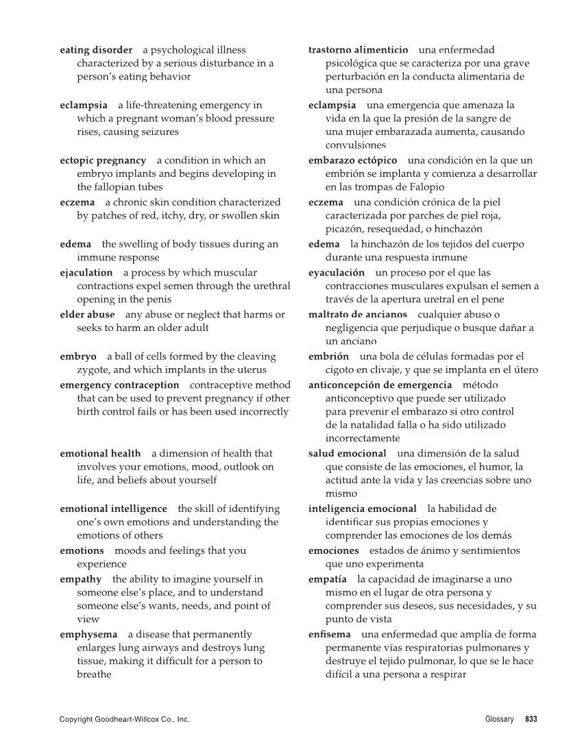 Copyright Goodheart-Willcox Co., Inc. Glossary 833 eating disorder a psychological illness r characterized by a serious disturbance in a person’s eating behavior eclampsia a life-threatening emergency in which a pregnant woman’s blood pressure rises, causing seizures ectopic pregnancy a condition in which an embryo implants and begins developing in the fallopian tubes eczema a chronic skin condition characterized by patches of red, itchy, dry, or swollen skin edema the swelling of body tissues during an immune response ejaculation a process by which muscular contractions expel semen through the urethral opening in the penis elder abuse any abuse or neglect that harms or seeks to harm an older adult embryo a ball of cells formed by the cleaving zygote, and which implants in the uterus emergency contraception contraceptive method that can be used to prevent pregnancy if other birth control fails or has been used incorrectly emotional health a dimension of health that involves your emotions, mood, outlook on life, and beliefs about yourself emotional intelligence the skill of identifying one’s own emotions and understanding the emotions of others emotions moods and feelings that you experience empathy the ability to imagine yourself in someone else’s place, and to understand someone else’s wants, needs, and point of view emphysema a disease that permanently enlarges lung airways and destroys lung tissue, making it difficult for a person to fi breathe trastorno alimenticio una enfermedad psicológica que se caracteriza por una grave perturbación en la conducta alimentaria de una persona eclampsia una emergencia que amenaza la vida en la que la presión de la sangre de una mujer embarazada aumenta, causando convulsiones embarazo ectópico una condición en la que un embrión se implanta y comienza a desarrollar en las trompas de Falopio eczema una condición crónica de la piel caracterizada por parches de piel roja, picazón, resequedad, o hinchazón edema la hinchazón de los tejidos del cuerpo durante una respuesta inmune eyaculación un proceso por el que las contracciones musculares expulsan el semen a través de la apertura uretral en el pene maltrato de ancianos cualquier abuso o negligencia que perjudique o busque dañar a un anciano embrión una bola de células formadas por el cigoto en clivaje, y que se implanta en el útero anticoncepción de emergencia método anticonceptivo que puede ser utilizado para prevenir el embarazo si otro control de la natalidad falla o ha sido utilizado incorrectamente salud emocional una dimensión de la salud que consiste de las emociones, el humor, la actitud ante la vida y las creencias sobre uno mismo inteligencia emocional la habilidad de identifi sus propias emociones y ficar comprender las emociones de los demás emociones estados de ánimo y sentimientos que uno experimenta empatía la capacidad de imaginarse a uno mismo en el lugar de otra persona y comprender sus deseos, sus necesidades, y su punto de vista enfi fisema una enfermedad que amplía de forma permanente vías respiratorias pulmonares y destruye el tejido pulmonar, lo que se le hace difícil a una persona a respirar