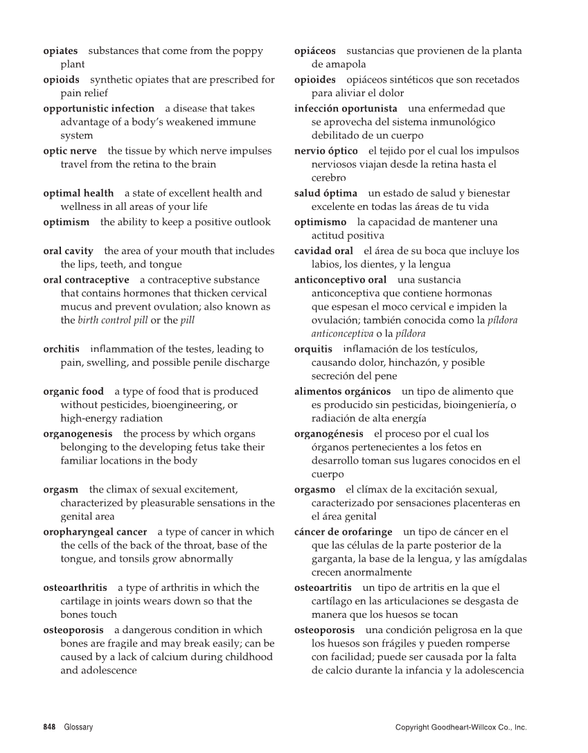 848 Glossary Copyright Goodheart-Willcox Co., Inc. opiates substances that come from the poppy plant opioids synthetic opiates that are prescribed for pain relief opportunistic infection a disease that takes advantage of a body’s weakened immune system optic nerve the tissue by which nerve impulses travel from the retina to the brain optimal health a state of excellent health and wellness in all areas of your life optimism the ability to keep a positive outlook oral cavity the area of your mouth that includes the lips, teeth, and tongue oral contraceptive a contraceptive substance that contains hormones that thicken cervical mucus and prevent ovulation also known as the birth control pill or the pill orchitis infl of the testes, leading to flammation pain, swelling, and possible penile discharge organic food a type of food that is produced without pesticides, bioengineering, or high-energy radiation organogenesis the process by which organs belonging to the developing fetus take their familiar locations in the body orgasm the climax of sexual excitement, characterized by pleasurable sensations in the genital area oropharyngeal cancer a type of cancer in which r the cells of the back of the throat, base of the tongue, and tonsils grow abnormally osteoarthritis a type of arthritis in which the cartilage in joints wears down so that the bones touch osteoporosis a dangerous condition in which bones are fragile and may break easily can be caused by a lack of calcium during childhood and adolescence opiáceos sustancias que provienen de la planta de amapola opioides opiáceos sintéticos que son recetados para aliviar el dolor infección oportunista una enfermedad que se aprovecha del sistema inmunológico debilitado de un cuerpo nervio óptico el tejido por el cual los impulsos nerviosos viajan desde la retina hasta el cerebro salud óptima un estado de salud y bienestar excelente en todas las áreas de tu vida optimismo la capacidad de mantener una actitud positiva cavidad oral el área de su boca que incluye los labios, los dientes, y la lengua anticonceptivo oral una sustancia anticonceptiva que contiene hormonas que espesan el moco cervical e impiden la ovulación también conocida como la píldora anticonceptiva o la píldora orquitis infl de los testículos, flamación causando dolor, hinchazón, y posible secreción del pene alimentos orgánicos un tipo de alimento que es producido sin pesticidas, bioingeniería, o radiación de alta energía organogénesis el proceso por el cual los órganos pertenecientes a los fetos en desarrollo toman sus lugares conocidos en el cuerpo orgasmo el clímax de la excitación sexual, caracterizado por sensaciones placenteras en el área genital cáncer de orofaringe un tipo de cáncer en el que las células de la parte posterior de la garganta, la base de la lengua, y las amígdalas crecen anormalmente osteoartritis un tipo de artritis en la que el cartílago en las articulaciones se desgasta de manera que los huesos se tocan osteoporosis una condición peligrosa en la que los huesos son frágiles y pueden romperse con facilidad puede ser causada por la falta de calcio durante la infancia y la adolescencia