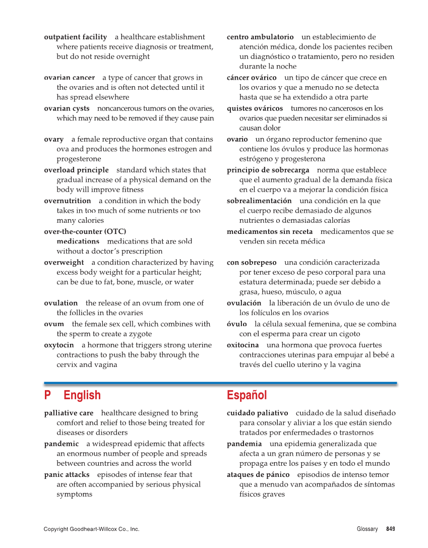Copyright Goodheart-Willcox Co., Inc. Glossary 849 outpatient facility a healthcare establishment where patients receive diagnosis or treatment, but do not reside overnight ovarian cancer a type of cancer that grows in r the ovaries and is often not detected until it has spread elsewhere ovarian cysts noncancerous tumors on the ovaries, which may need to be removed if they cause pain ovary a female reproductive organ that contains ova and produces the hormones estrogen and progesterone overload principle standard which states that gradual increase of a physical demand on the body will improve fitness fi overnutrition a condition in which the body takes in too much of some nutrients or too many calories over-the-counter (OTC) medications medications that are sold without a doctor’s prescription overweight a condition characterized by having excess body weight for a particular height can be due to fat, bone, muscle, or water ovulation the release of an ovum from one of the follicles in the ovaries ovum the female sex cell, which combines with the sperm to create a zygote oxytocin a hormone that triggers strong uterine contractions to push the baby through the cervix and vagina P English palliative care healthcare designed to bring comfort and relief to those being treated for diseases or disorders pandemic a widespread epidemic that affects an enormous number of people and spreads between countries and across the world panic attacks episodes of intense fear that are often accompanied by serious physical symptoms centro ambulatorio un establecimiento de atención médica, donde los pacientes reciben un diagnóstico o tratamiento, pero no residen durante la noche cáncer ovárico un tipo de cáncer que crece en los ovarios y que a menudo no se detecta hasta que se ha extendido a otra parte quistes ováricos tumores no cancerosos en los ovarios que pueden necesitar ser eliminados si causan dolor ovario un órgano reproductor femenino que contiene los óvulos y produce las hormonas estrógeno y progesterona principio de sobrecarga norma que establece que el aumento gradual de la demanda física en el cuerpo va a mejorar la condición física sobrealimentación una condición en la que el cuerpo recibe demasiado de algunos nutrientes o demasiadas calorías medicamentos sin receta medicamentos que se venden sin receta médica con sobrepeso una condición caracterizada por tener exceso de peso corporal para una estatura determinada puede ser debido a grasa, hueso, músculo, o agua ovulación la liberación de un óvulo de uno de los folículos en los ovarios óvulo la célula sexual femenina, que se combina con el esperma para crear un cigoto oxitocina una hormona que provoca fuertes contracciones uterinas para empujar al bebé a través del cuello uterino y la vagina Español cuidado paliativo cuidado de la salud diseñado para consolar y aliviar a los que están siendo tratados por enfermedades o trastornos pandemia una epidemia generalizada que afecta a un gran número de personas y se propaga entre los países y en todo el mundo ataques de pánico episodios de intenso temor que a menudo van acompañados de síntomas físicos graves