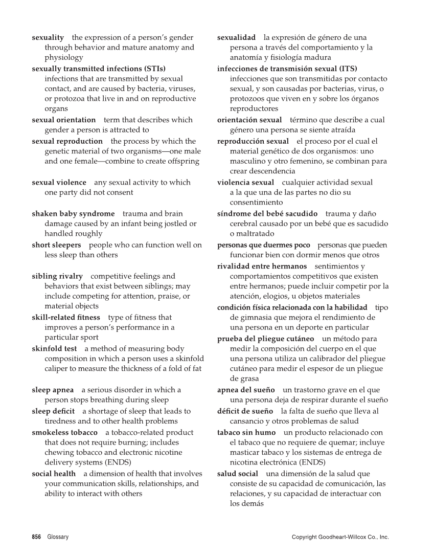 856 Glossary Copyright Goodheart-Willcox Co., Inc. sexuality the expression of a person’s gender through behavior and mature anatomy and physiology sexually transmitted infections (STIs) infections that are transmitted by sexual contact, and are caused by bacteria, viruses, or protozoa that live in and on reproductive organs sexual orientation term that describes which gender a person is attracted to sexual reproduction the process by which the genetic material of two organisms—one male and one female—combine to create offspring sexual violence any sexual activity to which one party did not consent shaken baby syndrome trauma and brain damage caused by an infant being jostled or handled roughly short sleepers people who can function well on less sleep than others sibling rivalry competitive feelings and behaviors that exist between siblings may include competing for attention, praise, or material objects skill-related fi tness type of fi tness that improves a person’s performance in a particular sport skinfold test a method of measuring body composition in which a person uses a skinfold caliper to measure the thickness of a fold of fat sleep apnea a serious disorder in which a person stops breathing during sleep sleep defi cit a shortage of sleep that leads to tiredness and to other health problems smokeless tobacco a tobacco-related product that does not require burning includes chewing tobacco and electronic nicotine delivery systems (ENDS) social health a dimension of health that involves your communication skills, relationships, and ability to interact with others sexualidad la expresión de género de una persona a través del comportamiento y la anatomía y fi siología madura infecciones de transmisión sexual (ITS) infecciones que son transmitidas por contacto sexual, y son causadas por bacterias, virus, o protozoos que viven en y sobre los órganos reproductores orientación sexual término que describe a cual género una persona se siente atraída reproducción sexual el proceso por el cual el material genético de dos organismos: uno masculino y otro femenino, se combinan para crear descendencia violencia sexual cualquier actividad sexual a la que una de las partes no dio su consentimiento síndrome del bebé sacudido trauma y daño cerebral causado por un bebé que es sacudido o maltratado personas que duermes poco personas que pueden funcionar bien con dormir menos que otros rivalidad entre hermanos sentimientos y comportamientos competitivos que existen entre hermanos puede incluir competir por la atención, elogios, u objetos materiales condición física relacionada con la habilidad tipo de gimnasia que mejora el rendimiento de una persona en un deporte en particular prueba del pliegue cutáneo un método para medir la composición del cuerpo en el que una persona utiliza un calibrador del pliegue cutáneo para medir el espesor de un pliegue de grasa apnea del sueño un trastorno grave en el que una persona deja de respirar durante el sueño défi cit de sueño la falta de sueño que lleva al cansancio y otros problemas de salud tabaco sin humo un producto relacionado con el tabaco que no requiere de quemar incluye masticar tabaco y los sistemas de entrega de nicotina electrónica (ENDS) salud social una dimensión de la salud que consiste de su capacidad de comunicación, las relaciones, y su capacidad de interactuar con los demás
