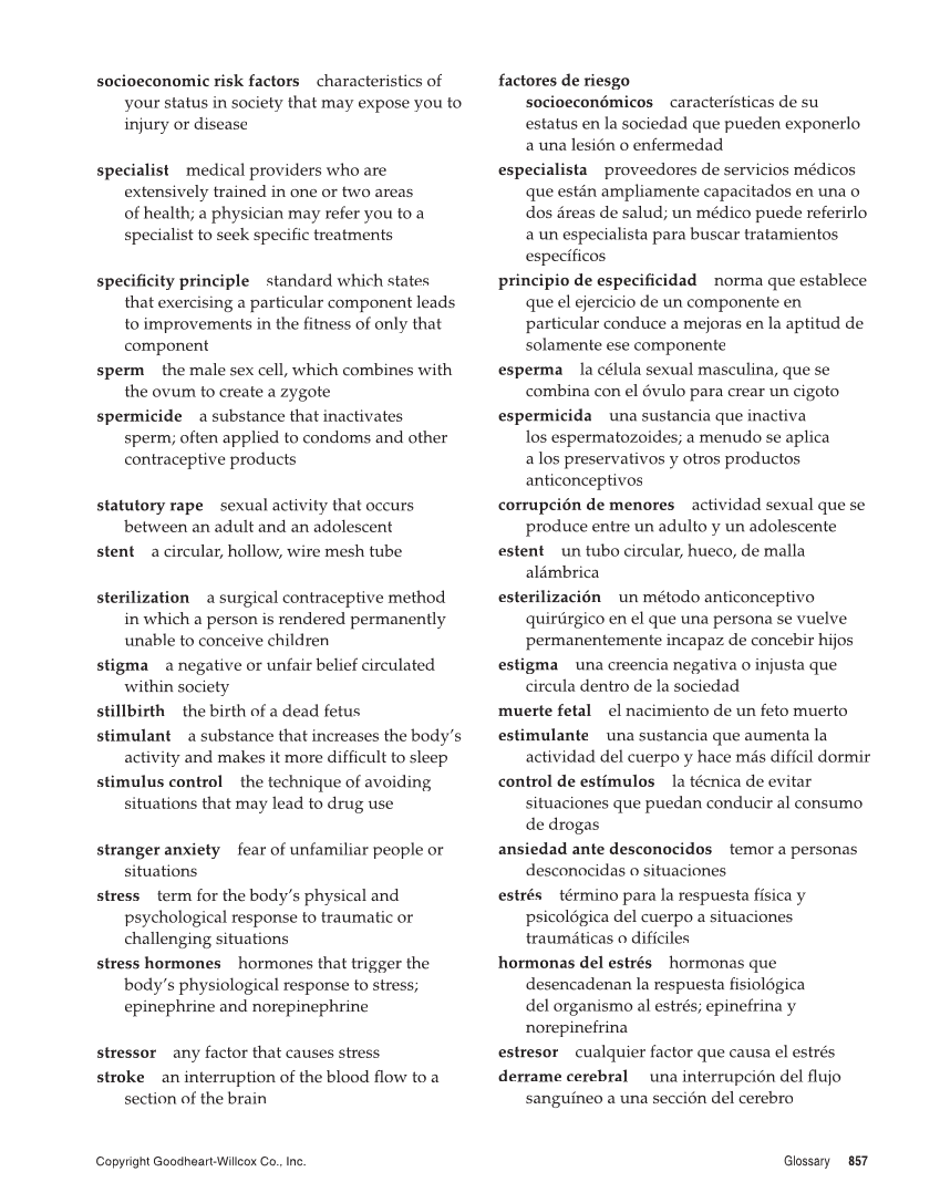 Copyright Goodheart-Willcox Co., Inc. Glossary 857 factores de riesgo socioeconómicos características de su estatus en la sociedad que pueden exponerlo a una lesión o enfermedad especialista proveedores de servicios médicos que están ampliamente capacitados en una o dos áreas de salud un médico puede referirlo a un especialista para buscar tratamientos específicosfi principio de especificidad fi norma que establece que el ejercicio de un componente en particular conduce a mejoras en la aptitud de solamente ese componente esperma la célula sexual masculina, que se combina con el óvulo para crear un cigoto espermicida una sustancia que inactiva los espermatozoides a menudo se aplica a los preservativos y otros productos anticonceptivos corrupción de menores actividad sexual que se produce entre un adulto y un adolescente estent un tubo circular, hueco, de malla alámbrica esterilización un método anticonceptivo quirúrgico en el que una persona se vuelve permanentemente incapaz de concebir hijos estigma una creencia negativa o injusta que circula dentro de la sociedad muerte fetal el nacimiento de un feto muerto estimulante una sustancia que aumenta la actividad del cuerpo y hace más difícil dormir control de estímulos la técnica de evitar situaciones que puedan conducir al consumo de drogas ansiedad ante desconocidos temor a personas desconocidas o situaciones estrés término para la respuesta física y psicológica del cuerpo a situaciones traumáticas o difíciles hormonas del estrés hormonas que desencadenan la respuesta fi siológica fi del organismo al estrés epinefrina y norepinefrina estresor cualquier factor que causa el estrés derrame cerebral una interrupción del fl ujo fl sanguíneo a una sección del cerebro socioeconomic risk factors characteristics of your status in society that may expose you to injury or disease specialist medical providers who are extensively trained in one or two areas of health a physician may refer you to a specialist to seek specific treatments fi specifi city principle fi standard which states that exercising a particular component leads to improvements in the fi tness of only that fi component sperm the male sex cell, which combines with the ovum to create a zygote spermicide a substance that inactivates sperm often applied to condoms and other contraceptive products statutory rape sexual activity that occurs between an adult and an adolescent stent a circular, hollow, wire mesh tube sterilization a surgical contraceptive method in which a person is rendered permanently unable to conceive children stigma a negative or unfair belief circulated within society stillbirth the birth of a dead fetus stimulant a substance that increases the body’s activity and makes it more difficult to sleep fi stimulus control the technique of avoiding situations that may lead to drug use stranger anxiety fear of unfamiliar people or situations stress term for the body’s physical and psychological response to traumatic or challenging situations stress hormones hormones that trigger the body’s physiological response to stress epinephrine and norepinephrine stressor any factor that causes stress r stroke an interruption of the blood flow to a fl section of the brain