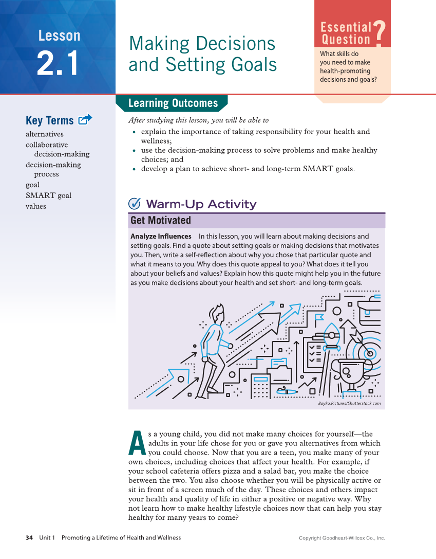 Learning Outcomes After studying this lesson, you will be able to ● ● explain the importance of taking responsibility for your health and wellness ● ● use the decision-making process to solve problems and make healthy choices and ● ● develop a plan to achieve short- and long-term SMART goals. Lesson 2.1 Making Decisions and Setting Goals Essential Question? What skills do you need to make health-promoting decisions and goals? Key Terms alternatives collaborative decision-making decision-making process goal SMART goal values A s a young child, you did not make many choices for yourself—the adults in your life chose for you or gave you alternatives from which you could choose. Now that you are a teen, you make many of your own choices, including choices that affect your health. For example, if your school cafeteria offers pizza and a salad bar, you make the choice between the two. You also choose whether you will be physically active or sit in front of a screen much of the day. These choices and others impact your health and quality of life in either a positive or negative way. Why not learn how to make healthy lifestyle choices now that can help you stay healthy for many years to come? Analyze Influences In this lesson, you will learn about making decisions and setting goals. Find a quote about setting goals or making decisions that motivates you. Then, write a self-reflection about why you chose that particular quote and what it means to you. Why does this quote appeal to you? What does it tell you about your beliefs and values? Explain how this quote might help you in the future as you make decisions about your health and set short- and long-term goals. Warm-Up Activity Get Motivated Boyko.Pictures/Shutterstock.com Copyright Goodheart-Willcox Co., Inc. 34 Unit 1 Promoting a Lifetime of Health and Wellness