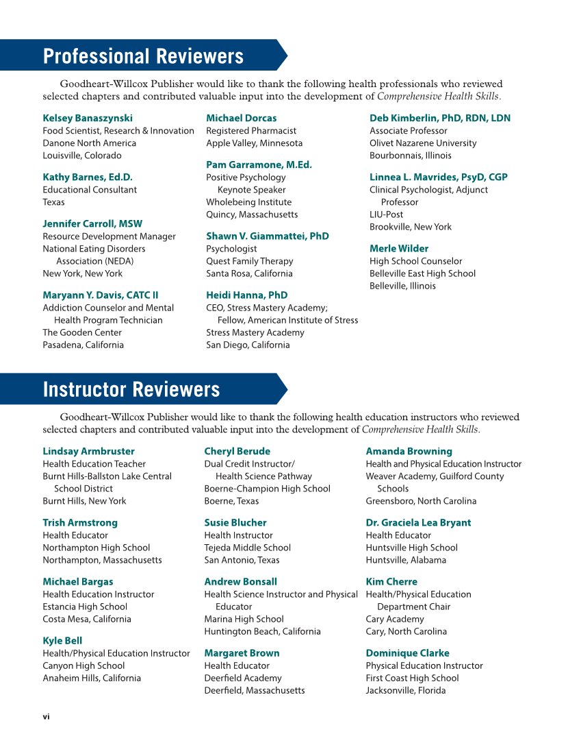 Professional Reviewers Professional Reviewers Goodheart-Willcox Publisher would like to thank the following health professionals who reviewed selected chapters and contributed valuable input into the development of Comprehensive Health Skills. Kelsey Banaszynski Food Scientist, Research & Innovation Danone North America Louisville, Colorado Kathy Barnes, Ed.D. Educational Consultant Texas Jennifer Carroll, MSW Resource Development Manager National Eating Disorders Association (NEDA) New York, New York Maryann Y. Davis, CATC II Addiction Counselor and Mental Health Program Technician The Gooden Center Pasadena, California Michael Dorcas Registered Pharmacist Apple Valley, Minnesota Pam Garramone, M.Ed. Positive Psychology Keynote Speaker Wholebeing Institute Quincy, Massachusetts Shawn V. Giammattei, PhD Psychologist Quest Family Therapy Santa Rosa, California Heidi Hanna, PhD CEO, Stress Mastery Academy Fellow, American Institute of Stress Stress Mastery Academy San Diego, California Deb Kimberlin, PhD, RDN, LDN Associate Professor Olivet Nazarene University Bourbonnais, Illinois Linnea L. Mavrides, PsyD, CGP Clinical Psychologist, Adjunct Professor LIU-Post Brookville, New York Merle Wilder High School Counselor Belleville East High School Belleville, Illinois Instructor Reviewers Instructor Reviewers Goodheart-Willcox Publisher would like to thank the following health education instructors who reviewed selected chapters and contributed valuable input into the development of Comprehensive Health Skills. Lindsay Armbruster Health Education Teacher Burnt Hills-Ballston Lake Central School District Burnt Hills, New York Trish Armstrong Health Educator Northampton High School Northampton, Massachusetts Michael Bargas Health Education Instructor Estancia High School Costa Mesa, California Kyle Bell Health/Physical Education Instructor Canyon High School Anaheim Hills, California Cheryl Berude Dual Credit Instructor/ Health Science Pathway Boerne-Champion High School Boerne, Texas Susie Blucher Health Instructor Tejeda Middle School San Antonio, Texas Andrew Bonsall Health Science Instructor and Physical Educator Marina High School Huntington Beach, California Margaret Brown Health Educator Deerfi eld Academy Deerfi eld, Massachusetts Amanda Browning Health and Physical Education Instructor Weaver Academy, Guilford County Schools Greensboro, North Carolina Dr. Graciela Lea Bryant Health Educator Huntsville High School Huntsville, Alabama Kim Cherre Health/Physical Education Department Chair Cary Academy Cary, North Carolina Dominique Clarke Physical Education Instructor First Coast High School Jacksonville, Florida vi