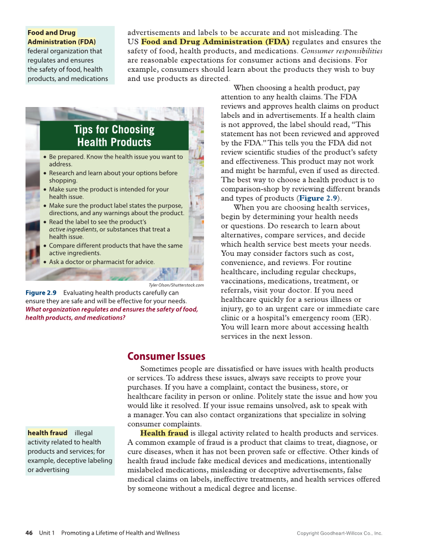 advertisements and labels to be accurate and not misleading. The US Food and Drug Administration (FDA) regulates and ensures the safety of food, health products, and medications. Consumer responsibilities are reasonable expectations for consumer actions and decisions. For example, consumers should learn about the products they wish to buy and use products as directed. When choosing a health product, pay attention to any health claims. The FDA reviews and approves health claims on product labels and in advertisements. If a health claim is not approved, the label should read, “This statement has not been reviewed and approved by the FDA.” This tells you the FDA did not review scientific studies of the product’s safety and effectiveness. This product may not work and might be harmful, even if used as directed. The best way to choose a health product is to comparison-shop by reviewing different brands and types of products (Figure 2.9). When you are choosing health services, begin by determining your health needs or questions. Do research to learn about alternatives, compare services, and decide which health service best meets your needs. You may consider factors such as cost, convenience, and reviews. For routine healthcare, including regular checkups, vaccinations, medications, treatment, or referrals, visit your doctor. If you need healthcare quickly for a serious illness or injury, go to an urgent care or immediate care clinic or a hospital’s emergency room (ER). You will learn more about accessing health services in the next lesson. Consumer Issues Sometimes people are dissatisfied or have issues with health products or services. To address these issues, always save receipts to prove your purchases. If you have a complaint, contact the business, store, or healthcare facility in person or online. Politely state the issue and how you would like it resolved. If your issue remains unsolved, ask to speak with a manager. You can also contact organizations that specialize in solving consumer complaints. Health fraud is illegal activity related to health products and services. A common example of fraud is a product that claims to treat, diagnose, or cure diseases, when it has not been proven safe or effective. Other kinds of health fraud include fake medical devices and medications, intentionally mislabeled medications, misleading or deceptive advertisements, false medical claims on labels, ineffective treatments, and health services offered by someone without a medical degree and license. Food and Drug Administration (FDA) federal organization that regulates and ensures the safety of food, health products, and medications health fraud illegal activity related to health products and services for example, deceptive labeling or advertising Tyler Olson/Shutterstock.com Figure 2.9 Evaluating health products carefully can ensure they are safe and will be effective for your needs. What organization regulates and ensures the safety of food, health products, and medications? Tips for Choosing Health Products ● ● Be prepared. Know the health issue you want to address. ● ● Research and learn about your options before shopping. ● ● Make sure the product is intended for your health issue. ● ● Make sure the product label states the purpose, directions, and any warnings about the product. ● ● Read the label to see the product’s active ingredients, or substances that treat a health issue. ● ● Compare different products that have the same active ingredients. ● ● Ask a doctor or pharmacist for advice. Copyright Goodheart-Willcox Co., Inc. 46 Unit 1 Promoting a Lifetime of Health and Wellness