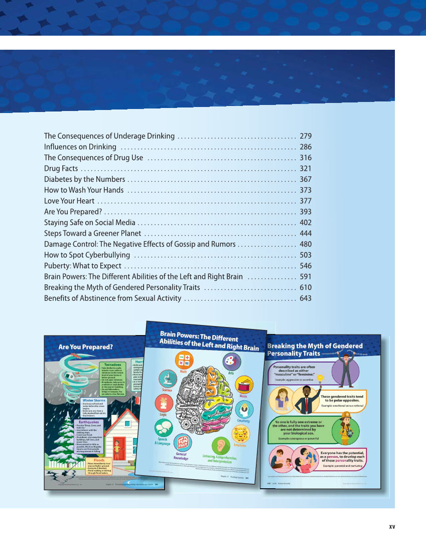 xv The Consequences of Underage Drinking . . . . . . . . . . . . . . . . . . . . . . . . . . . . . . . . . . . . 279 Influences on Drinking . . . . . . . . . . . . . . . . . . . . . . . . . . . . . . . . . . . . . . . . . . . . . . . . . . . . . 286 The Consequences of Drug Use . . . . . . . . . . . . . . . . . . . . . . . . . . . . . . . . . . . . . . . . . . . . . 316 Drug Facts . . . . . . . . . . . . . . . . . . . . . . . . . . . . . . . . . . . . . . . . . . . . . . . . . . . . . . . . . . . . . . . . . 321 Diabetes by the Numbers . . . . . . . . . . . . . . . . . . . . . . . . . . . . . . . . . . . . . . . . . . . . . . . . . . . 367 How to Wash Your Hands . . . . . . . . . . . . . . . . . . . . . . . . . . . . . . . . . . . . . . . . . . . . . . . . . . . 373 Love Your Heart . . . . . . . . . . . . . . . . . . . . . . . . . . . . . . . . . . . . . . . . . . . . . . . . . . . . . . . . . . . . 377 Are You Prepared? . . . . . . . . . . . . . . . . . . . . . . . . . . . . . . . . . . . . . . . . . . . . . . . . . . . . . . . . . . 393 Staying Safe on Social Media . . . . . . . . . . . . . . . . . . . . . . . . . . . . . . . . . . . . . . . . . . . . . . . . 402 Steps Toward a Greener Planet . . . . . . . . . . . . . . . . . . . . . . . . . . . . . . . . . . . . . . . . . . . . . . 444 Damage Control: The Negative Effects of Gossip and Rumors . . . . . . . . . . . . . . . . . . 480 How to Spot Cyberbullying . . . . . . . . . . . . . . . . . . . . . . . . . . . . . . . . . . . . . . . . . . . . . . . . . 503 Puberty: What to Expect . . . . . . . . . . . . . . . . . . . . . . . . . . . . . . . . . . . . . . . . . . . . . . . . . . . . 546 Brain Powers: The Different Abilities of the Left and Right Brain . . . . . . . . . . . . . . . 591 Breaking the Myth of Gendered Personality Traits . . . . . . . . . . . . . . . . . . . . . . . . . . . . 610 Benefits of Abstinence from Sexual Activity . . . . . . . . . . . . . . . . . . . . . . . . . . . . . . . . . . 643