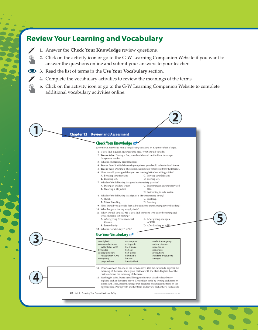 Review Your Learning and Vocabulary 1. Answer the Check Your Knowledge review questions. 2. Click on the activity icon or go to the G-W Learning Companion Website if you want to answer the questions online and submit your answers to your teacher. 3. Read the list of terms in the Use Your Vocabulary section. 4. Complete the vocabulary activities to review the meanings of the terms. 5. Click on the activity icon or go to the G-W Learning Companion Website to complete additional vocabulary activities online. Chapter 12 Review and Assessment Unit 5 Protecting Your Physical Health and Safety Copyright Goodheart-Willcox Co., Inc. 420 Check Your Knowledge Record your answers to each of the following questions on a separate sheet of paper. 1. If you find a gun in an unsecured area, what should you do? 2. True or false. During a fire, you should crawl on the floor to escape dangerous smoke. 3. What is emergency preparedness? 4. True or false. If a thief demands your phone, you should refuse to hand it over. 5. True or false. Deleting a photo online completely removes it from the Internet. 6. How should you signal that you are turning left when riding a bike? A. Bending your forearm. B. Pointing left. C. Waving your left arm. D. Veering left. 7. Which of the following is a good water-safety practice? A. Diving in shallow water. B. Wearing a life jacket. C. Swimming in an unsupervised area. D. Swimming in cold water. 8. Which of the following is a sign of a life-threatening injury? A. Shock. B. Minor bleeding. C. Swelling. D. Bruising. 9. How should you provide first aid to someone experiencing severe bleeding? 10. What happens during anaphylaxis? 11. When should you call 911 if you find someone who is not breathing and whose heart is not beating? A. After giving five abdominal thrusts. B. Immediately. C. After giving one cycle of CPR. D. After finding an AED. 12. What is Hands-Only™ CPR? Use Your Vocabulary anaphylaxis automated external defibrillator (AED) bystander cardiopulmonary resuscitation (CPR) emergency preparedness escape plan extinguish fire triangle first aid first-aid kit flammable hackers identity theft medical emergency natural disasters pedestrians poisonous precautions standard precautions strangers 13. Draw a cartoon for one of the terms above. Use the cartoon to express the meaning of the term. Share your cartoon with the class. Explain how the cartoon shows the meaning of the term. 14. Working in pairs, locate a small image online that visually describes or explains each of the terms above. Create flash cards by writing each term on a note card. Then, paste the image that describes or explains the term on the opposite side. Pair up with another team and review each other’s flash cards. 2 1 5 3 4
