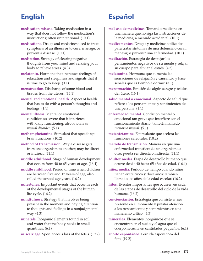 English Español Copyright Goodheart-Willcox Co., Inc. Glossary/ Glosario 679 medication misuse. Taking medication in a way that does not follow the medication’s instructions often unintentional. (10.1) mal uso de medicinas. Tomando medicina en una manera que no siga las instrucciones de la medicina a menudo accidental. (10.1) medications. Drugs and medicines used to treat symptoms of an illness or to cure, manage, or prevent a disease. (10.1) medicamentos. Drogas y medicinas utilizados para tratar síntomas de una dolencia o curar, manejar, o prevenir una enfermedad. (10.1) meditation. Strategy of clearing negative thoughts from your mind and relaxing your body to relieve stress. (4.3) meditación. Estrategia de despejar los pensamientos negativos de su mente y relajar su cuerpo para aliviar el estrés. (4.3) melatonin. Hormone that increases feelings of relaxation and sleepiness and signals that it is time to go to sleep. (3.1) melatonina. Hormona que aumenta las sensaciones de relajación y cansancio y hace señales que es tiempo a dormir. (3.1) menstruation. Discharge of some blood and tissues from the uterus. (16.1) menstruación. Emisión de algún sangre y tejidos del útero. (16.1) mental and emotional health. Aspect of health that has to do with a person’s thoughts and feelings. (1.1) salud mental o emocional. Aspecto de salud que refiere a los pensamientos y sentimientos de una persona. (1.1) mental illness. Mental or emotional condition so severe that it interferes with daily functioning also known as mental disorder. (5.1) enfermedad mental. Condición mental o emocional tan grave que interfiere con el funcionamiento diario también llamado trastorno mental. (5.1) methamphetamine. Stimulant that speeds up brain functions. (10.2) metanfetamina. Estimulante que acelera las funciones cerebrales. (10.2) method of transmission. Way a disease gets from one organism to another may be direct or indirect. (11.1) método de transmisión. Manera en que una enfermedad transfiera de un organismo a otro pueda ser directa o indirecta. (11.1) middle adulthood. Stage of human development that occurs from 40 to 65 years of age. (16.4) adultez media. Etapa de desarrollo humano que ocurre desde 40 hasta 65 años de edad. (16.4) middle childhood. Period of time when children are between five and 12 years of age also called the school-age years. (16.2) niñez media. Período de tiempo cuando niños tienen entre cinco y doce años también llamado los años de la edad escolar. (16.2) milestones. Important events that occur in each of the developmental stages of the human life cycle. (16.2) hitos. Eventos importantes que ocurren en cada de las etapas de desarrollo del ciclo de la vida humana. (16.2) mindfulness. Strategy that involves being present in the moment and paying attention to thoughts and feelings in a nonjudgmental way. (4.3) concienciación. Estrategia que consiste en ser presente en el momento y prestar atención a los pensamientos y sentimientos en una manera no crítico. (4.3) minerals. Inorganic elements found in soil and water that the body needs in small quantities. (6.1) minerales. Elementos inorgánicos que se encuentran en el suelo y el agua que el cuerpo necesita en cantidades pequeños. (6.1) miscarriage. Spontaneous loss of the fetus. (19.2) aborto espontáneo. Pérdida espontánea del feto. (19.2)