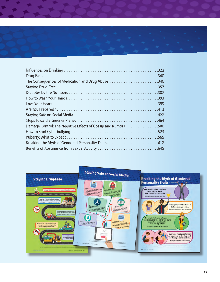 xv Influences on Drinking . . . . . . . . . . . . . . . . . . . . . . . . . . . . . . . . . . . . . . . . . . . . . . . . . . . . . . . 322 Drug Facts. . . . . . . . . . . . . . . . . . . . . . . . . . . . . . . . . . . . . . . . . . . . . . . . . . . . . . . . . . . . . . . . . . 340 The Consequences of Medication and Drug Abuse . . . . . . . . . . . . . . . . . . . . . . . . . . . . . 346 Staying Drug-Free. . . . . . . . . . . . . . . . . . . . . . . . . . . . . . . . . . . . . . . . . . . . . . . . . . . . . . . . . . . 357 Diabetes by the Numbers. . . . . . . . . . . . . . . . . . . . . . . . . . . . . . . . . . . . . . . . . . . . . . . . . . . . 387 How to Wash Your Hands. . . . . . . . . . . . . . . . . . . . . . . . . . . . . . . . . . . . . . . . . . . . . . . . . . . . . 393 Love Your Heart. . . . . . . . . . . . . . . . . . . . . . . . . . . . . . . . . . . . . . . . . . . . . . . . . . . . . . . . . . . . . 399 Are You Prepared?. . . . . . . . . . . . . . . . . . . . . . . . . . . . . . . . . . . . . . . . . . . . . . . . . . . . . . . . . . . 413 Staying Safe on Social Media. . . . . . . . . . . . . . . . . . . . . . . . . . . . . . . . . . . . . . . . . . . . . . . . . 422 Steps Toward a Greener Planet. . . . . . . . . . . . . . . . . . . . . . . . . . . . . . . . . . . . . . . . . . . . . . . 464 Damage Control: The Negative Effects of Gossip and Rumors. . . . . . . . . . . . . . . . . . . 500 How to Spot Cyberbullying. . . . . . . . . . . . . . . . . . . . . . . . . . . . . . . . . . . . . . . . . . . . . . . . . . . 523 Puberty: What to Expect. . . . . . . . . . . . . . . . . . . . . . . . . . . . . . . . . . . . . . . . . . . . . . . . . . . . . 565 Breaking the Myth of Gendered Personality Traits. . . . . . . . . . . . . . . . . . . . . . . . . . . . . . 612 Benefits of Abstinence from Sexual Activity. . . . . . . . . . . . . . . . . . . . . . . . . . . . . . . . . . . 645