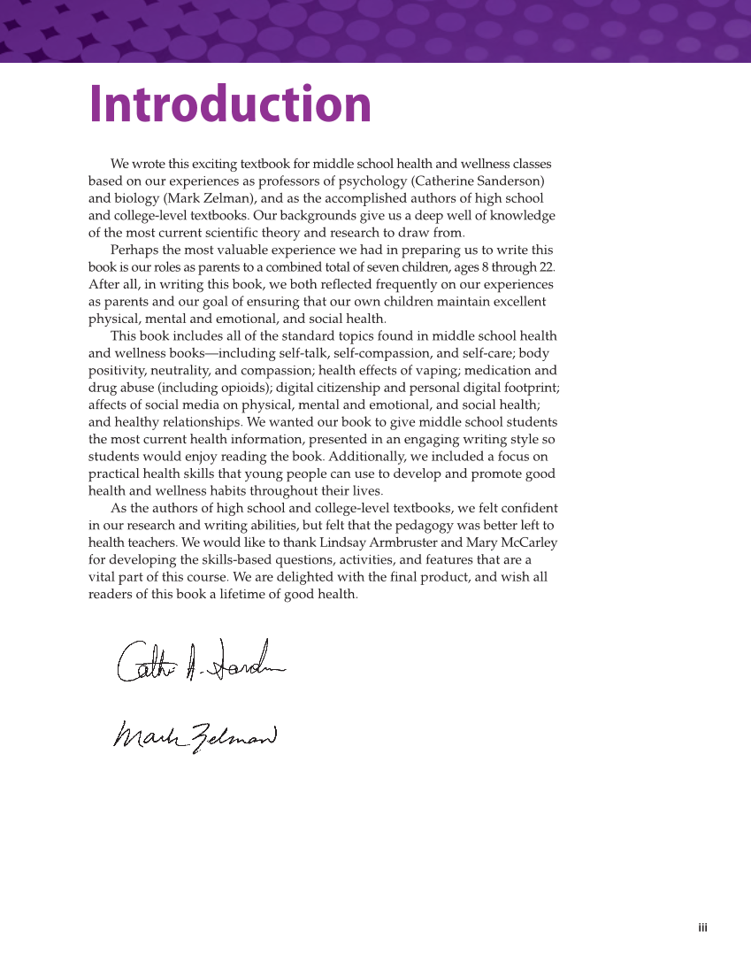 iii Introduction We wrote this exciting textbook for middle school health and wellness classes based on our experiences as professors of psychology (Catherine Sanderson) and biology (Mark Zelman), and as the accomplished authors of high school and college-level textbooks. Our backgrounds give us a deep well of knowledge of the most current scientific theory and research to draw from. Perhaps the most valuable experience we had in preparing us to write this book is our roles as parents to a combined total of seven children, ages 8 through 22. After all, in writing this book, we both reflected frequently on our experiences as parents and our goal of ensuring that our own children maintain excellent physical, mental and emotional, and social health. This book includes all of the standard topics found in middle school health and wellness books—including self-talk, self-compassion, and self-care body positivity, neutrality, and compassion health effects of vaping medication and drug abuse (including opioids) digital citizenship and personal digital footprint affects of social media on physical, mental and emotional, and social health and healthy relationships. We wanted our book to give middle school students the most current health information, presented in an engaging writing style so students would enjoy reading the book. Additionally, we included a focus on practical health skills that young people can use to develop and promote good health and wellness habits throughout their lives. As the authors of high school and college-level textbooks, we felt confident in our research and writing abilities, but felt that the pedagogy was better left to health teachers. We would like to thank Lindsay Armbruster and Mary McCarley for developing the skills-based questions, activities, and features that are a vital part of this course. We are delighted with the final product, and wish all readers of this book a lifetime of good health.