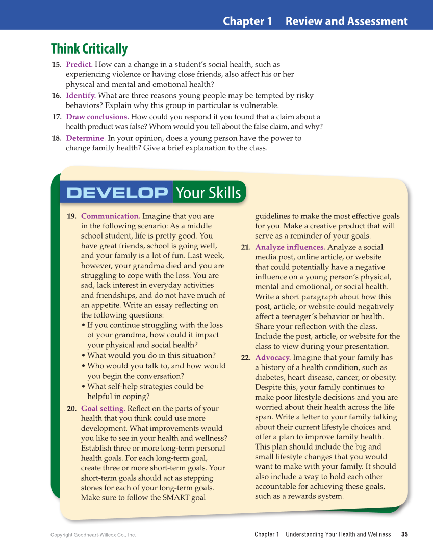 Chapter 1 Review and Assessment Copyright Goodheart-Willcox Co., Inc. Chapter 1 Understanding Your Health and Wellness 35 Think Critically 15. Predict. How can a change in a student’s social health, such as experiencing violence or having close friends, also affect his or her physical and mental and emotional health? 16. Identify. What are three reasons young people may be tempted by risky behaviors? Explain why this group in particular is vulnerable. 17. Draw conclusions. How could you respond if you found that a claim about a health product was false? Whom would you tell about the false claim, and why? 18. Determine. In your opinion, does a young person have the power to change family health? Give a brief explanation to the class. 19. Communication. Imagine that you are in the following scenario: As a middle school student, life is pretty good. You have great friends, school is going well, and your family is a lot of fun. Last week, however, your grandma died and you are struggling to cope with the loss. You are sad, lack interest in everyday activities and friendships, and do not have much of an appetite. Write an essay reflecting on the following questions: • If you continue struggling with the loss of your grandma, how could it impact your physical and social health? • What would you do in this situation? • Who would you talk to, and how would you begin the conversation? • What self-help strategies could be helpful in coping? 20. Goal setting. Reflect on the parts of your health that you think could use more development. What improvements would you like to see in your health and wellness? Establish three or more long-term personal health goals. For each long-term goal, create three or more short-term goals. Your short-term goals should act as stepping stones for each of your long-term goals. Make sure to follow the SMART goal guidelines to make the most effective goals for you. Make a creative product that will serve as a reminder of your goals. 21. Analyze influences. Analyze a social media post, online article, or website that could potentially have a negative influence on a young person’s physical, mental and emotional, or social health. Write a short paragraph about how this post, article, or website could negatively affect a teenager’s behavior or health. Share your reflection with the class. Include the post, article, or website for the class to view during your presentation. 22. Advocacy. Imagine that your family has a history of a health condition, such as diabetes, heart disease, cancer, or obesity. Despite this, your family continues to make poor lifestyle decisions and you are worried about their health across the life span. Write a letter to your family talking about their current lifestyle choices and offer a plan to improve family health. This plan should include the big and small lifestyle changes that you would want to make with your family. It should also include a way to hold each other accountable for achieving these goals, such as a rewards system. DEVELOP Your Skills