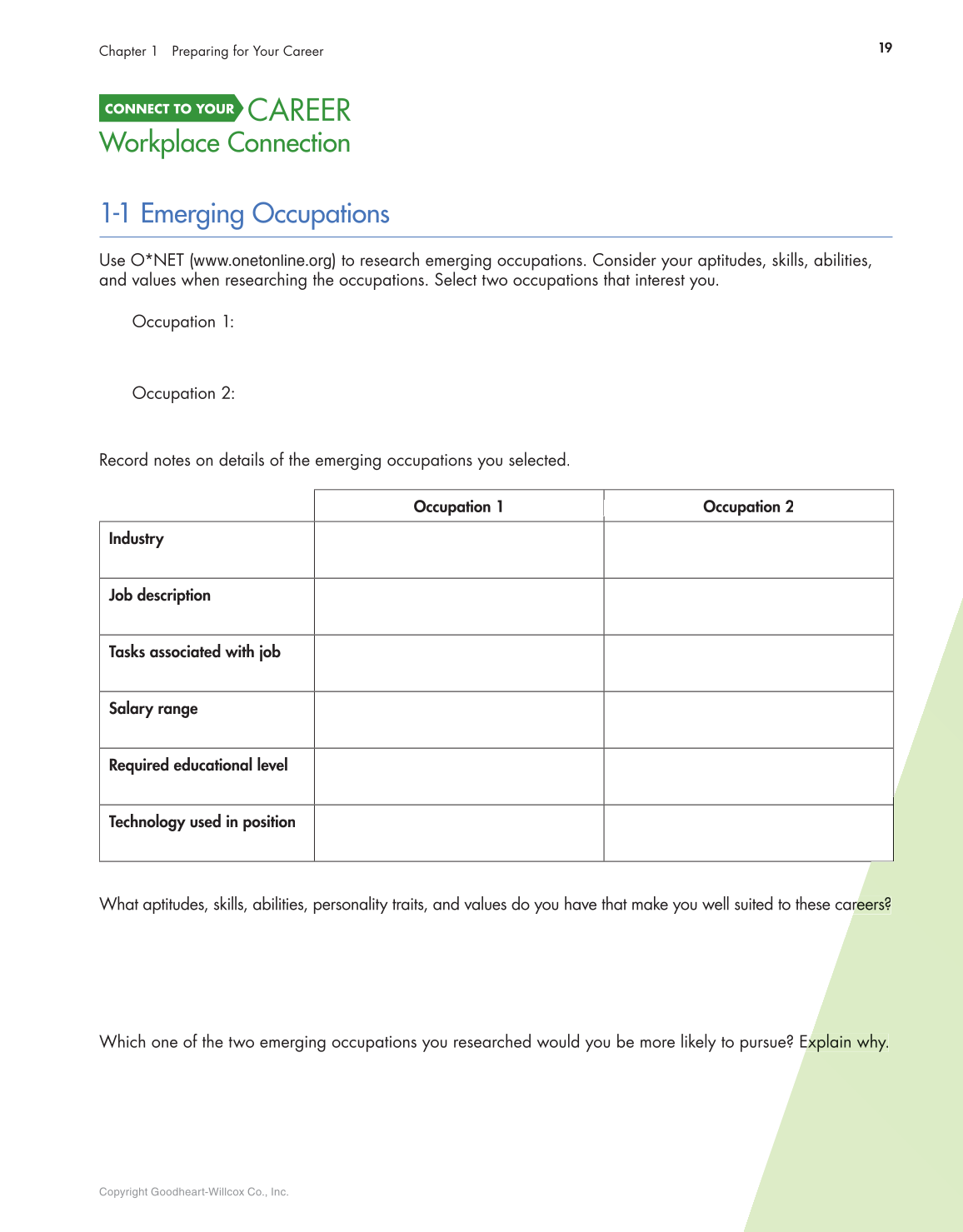 Use O*NET (www.onetonline.org) to research emerging occupations. Consider your aptitudes, skills, abilities,