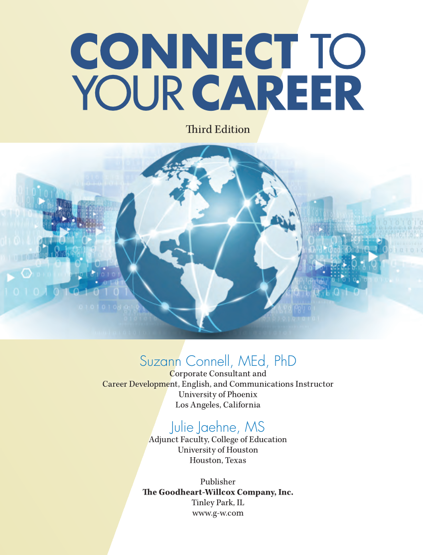 Suzann Connell, MEd, PhD Corporate Consultant and Career Development, English, and Communications Instructor University of Phoenix Los Angeles, California Julie Jaehne, MS Adjunct Faculty, College of Education University of Houston Houston, Texas Publisher The Goodheart-Willcox Company, Inc. Tinley Park, IL www.g-w.com CONNECT TO YOUR CAREER Third Edition
