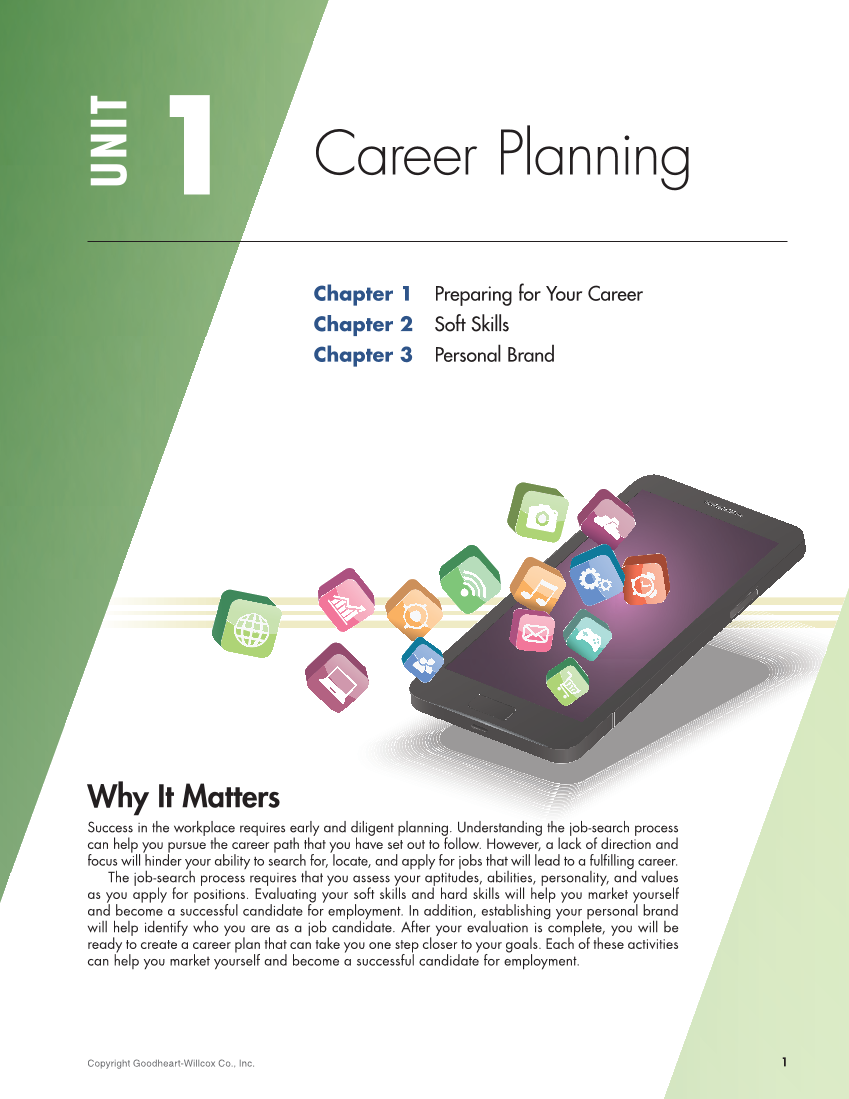 Career Planning Chapter 1 Preparing for Your Career Chapter 2 Soft Skills Chapter 3 Personal Brand Why It Matters Success in the workplace requires early and diligent planning. Understanding the job-search process can help you pursue the career path that you have set out to follow. However, a lack of direction and focus will hinder your ability to search for, locate, and apply for jobs that will lead to a fulfilling career. The job-search process requires that you assess your aptitudes, abilities, personality, and values as you apply for positions. Evaluating your soft skills and hard skills will help you market yourself and become a successful candidate for employment. In addition, establishing your personal brand will help identify who you are as a job candidate. After your evaluation is complete, you will be ready to create a career plan that can take you one step closer to your goals. Each of these activities can help you market yourself and become a successful candidate for employment. UNIT 1 1 Copyright Goodheart-Willcox Co., Inc.