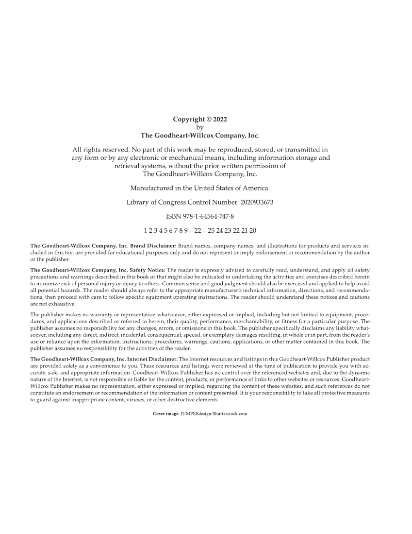 Copyright © 2022 by The Goodheart-Willcox Company, Inc. All rights reserved. No part of this work may be reproduced, stored, or transmitted in any form or by any electronic or mechanical means, including information storage and retrieval systems, without the prior written permission of The Goodheart-Willcox Company, Inc. Manufactured in the United States of America. Library of Congress Control Number: 2020933673 ISBN 978-1-64564-747-8 1 2 3 4 5 6 7 8 9 – 22 – 25 24 23 22 21 20 The Goodheart-Willcox Company, Inc. Brand Disclaimer: Brand names, company names, and illustrations for products and services in- cluded in this text are provided for educational purposes only and do not represent or imply endorsement or recommendation by the author or the publisher. The Goodheart-Willcox Company, Inc. Safety Notice: The reader is expressly advised to carefully read, understand, and apply all safety precautions and warnings described in this book or that might also be indicated in undertaking the activities and exercises described herein to minimize risk of personal injury or injury to others. Common sense and good judgment should also be exercised and applied to help avoid all potential hazards. The reader should always refer to the appropriate manufacturer’s technical information, directions, and recommenda- tions then proceed with care to follow specific equipment operating instructions. The reader should understand these notices and cautions are not exhaustive. The publisher makes no warranty or representation whatsoever, either expressed or implied, including but not limited to equipment, proce- dures, and applications described or referred to herein, their quality, performance, merchantability, or fi tness for a particular purpose. The publisher assumes no responsibility for any changes, errors, or omissions in this book. The publisher specifically disclaims any liability what- soever, including any direct, indirect, incidental, consequential, special, or exemplary damages resulting, in whole or in part, from the reader’s use or reliance upon the information, instructions, procedures, warnings, cautions, applications, or other matter contained in this book. The publisher assumes no responsibility for the activities of the reader. The Goodheart-Willcox Company, Inc. Internet Disclaimer: The Internet resources and listings in this Goodheart-Willcox Publisher product are provided solely as a convenience to you. These resources and listings were reviewed at the time of publication to provide you with ac- curate, safe, and appropriate information. Goodheart-Willcox Publisher has no control over the referenced websites and, due to the dynamic nature of the Internet, is not responsible or liable for the content, products, or performance of links to other websites or resources. Goodheart- Willcox Publisher makes no representation, either expressed or implied, regarding the content of these websites, and such references do not constitute an endorsement or recommendation of the information or content presented. It is your responsibility to take all protective measures to guard against inappropriate content, viruses, or other destructive elements. Cover image: JUMPEEdesign/Shutterstock.com