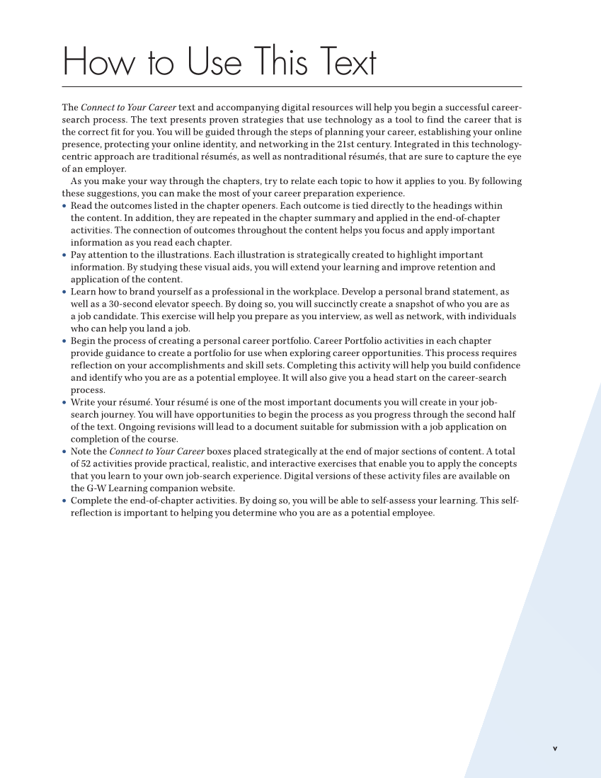 How to Use This Text The Connect to Your Career text and accompanying digital resources will help you begin a successful career- search process. The text presents proven strategies that use technology as a tool to find the career that is the correct fit for you. You will be guided through the steps of planning your career, establishing your online presence, protecting your online identity, and networking in the 21st century. Integrated in this technology- centric approach are traditional résumés, as well as nontraditional résumés, that are sure to capture the eye of an employer. As you make your way through the chapters, try to relate each topic to how it applies to you. By following these suggestions, you can make the most of your career preparation experience. • Read the outcomes listed in the chapter openers. Each outcome is tied directly to the headings within the content. In addition, they are repeated in the chapter summary and applied in the end-of-chapter activities. The connection of outcomes throughout the content helps you focus and apply important information as you read each chapter. • Pay attention to the illustrations. Each illustration is strategically created to highlight important information. By studying these visual aids, you will extend your learning and improve retention and application of the content. • Learn how to brand yourself as a professional in the workplace. Develop a personal brand statement, as well as a 30-second elevator speech. By doing so, you will succinctly create a snapshot of who you are as a job candidate. This exercise will help you prepare as you interview, as well as network, with individuals who can help you land a job. • Begin the process of creating a personal career portfolio. Career Portfolio activities in each chapter provide guidance to create a portfolio for use when exploring career opportunities. This process requires reflection on your accomplishments and skill sets. Completing this activity will help you build confidence and identify who you are as a potential employee. It will also give you a head start on the career-search process. • Write your résumé. Your résumé is one of the most important documents you will create in your job- search journey. You will have opportunities to begin the process as you progress through the second half of the text. Ongoing revisions will lead to a document suitable for submission with a job application on completion of the course. • Note the Connect to Your Career boxes placed strategically at the end of major sections of content. A total of 52 activities provide practical, realistic, and interactive exercises that enable you to apply the concepts that you learn to your own job-search experience. Digital versions of these activity files are available on the G-W Learning companion website. • Complete the end-of-chapter activities. By doing so, you will be able to self-assess your learning. This self- reflection is important to helping you determine who you are as a potential employee. v