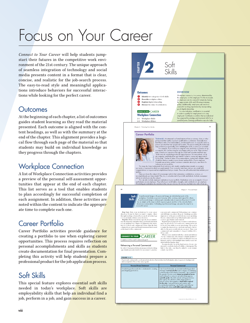 Focus on Your Career OVERVIEW Workplace success is, in a sense, determined by the employee, not the employer. For the most part, an employee can be successful simply by having the appropriate skills and following company policy. Additionally, employees can ensure a successful working experience by incorporating good digital citizenship. In some industries, certification is essential in order to qualify for employment or to stay employed. Certification confi rms that an individual has acquired knowledge and mastered skills for a specified area. Earning certification can also help not only ensure workplace success, but possibly help project a career forward, as well. Soft Skills Outcomes 1 Identify two categories of soft skills. 2 Describe workplace ethics. 3 Explain digital citizenship. 4 Discuss the value of certification. CONNECT TO YOUR CAREER Workplace Connection 2-1 Workplace Skills 2-2 Workplace Ethics 2-3 Digital Citizenship 2-4 Certification Options 2 CHAPTER 24 Copyright Goodheart-Willcox Co., Inc. tto t l k l b t ibl p t t l re w w k l b t ibl Security Settings Before using the Internet, become acquainted with the security settings and features of your browser. First, look for a menu called Tools, Settings, or similar. Within menu, your web browser’s security features, sometimes called Internet options, Privacy settings, or Security. Change your settings to protect your computer and your Enabling a pop-up blocker prevents your web browser from allowing you to see pop-up ads, which often contain malware. If your computer or mobile device has a built-in web camera, consider keeping it covered or deactivated when not in use. Even if they are not actively being used, cameras can be accessed remotely by unauthor--orh ized users, essentially gaining access to a live stream of day-to-day life.. Back up Your An important part of a security plan is backing up the data on your computer. If a virus invades your computer or the hard disk crashes, it may be too late to retrieve your files and computer programs. Having a backup can prevent losing files.. Put a plan in place to perform regular back-ups. Decide on a storage device and method for backing your files. Place the backup in a fireproof container and store it at a location other than your home, if possible.. Career Portfolio Testimonials. A testimonial is a formal statement from a customer, client, or other professional that certifies a person’s qualifications or character. Generally more brief than a letter of recommendation, a testimonial focuses on a specific action a person executed that was exceptional in nature. The person writing the testimonial may not know you personally, but is validating the work or service you provided. For example, if you work at a computer store and help a customer set up a computer, the customer may be very happy with your work. That customer may contact your supervisor through an e-mail with a testimonial that says, “Justin was an outstanding technical support person. He was patient, set up my computer, and helped me get started. I want to convey my appreciation for his help.” Similar to letters of recommendation, testimonials validate claims of abilities that you made in your résumé and portfolio. If your employer forwards any positive written customer comments about you, save these for inclusion in your portfolio. You may also have testimonials from instructors who made complimentary remarks on a paper you wrote or a project in which you participated. Your counselor may have sent you an e-mail with congratulations on a personal accomplishment that you made. These are all testimonials that validate your abilities. Have you been the subject of a newspaper article that summarizes contributions, services, or accomplishments you have made? This, too, is a testimonial of your skills and talents. Include newspaper articles in which you are the subject. You can also include employer evaluations in your portfolio. Evaluations serve as a snapshot of your performance as an employee. They reflect your work habits, strengths, and contribution to an employer. If including an evaluation, be selective in the one you choose. Do not use one that is too old or from an employer that might be competitive with the company for which you are applying for a job. 1. Sort through testimonials that you have collected. Include assignments that have an instructor’s written comments about your work. Print any e-mails from instructors, community members, or that complemented your actions on something you did for that person. Attach notes to each document to identify what it is and why it is included in the portfolio. For example, a note on a research paper you wrote might say, “Research paper, Professor Dansby, commenting on my writing skills.” 2. Search through recent employer evaluation forms have kept. If have evaluations that are appropriate, include michaeljung/Shutterstock.com Copyright Goodheart-Willcox Co.,
