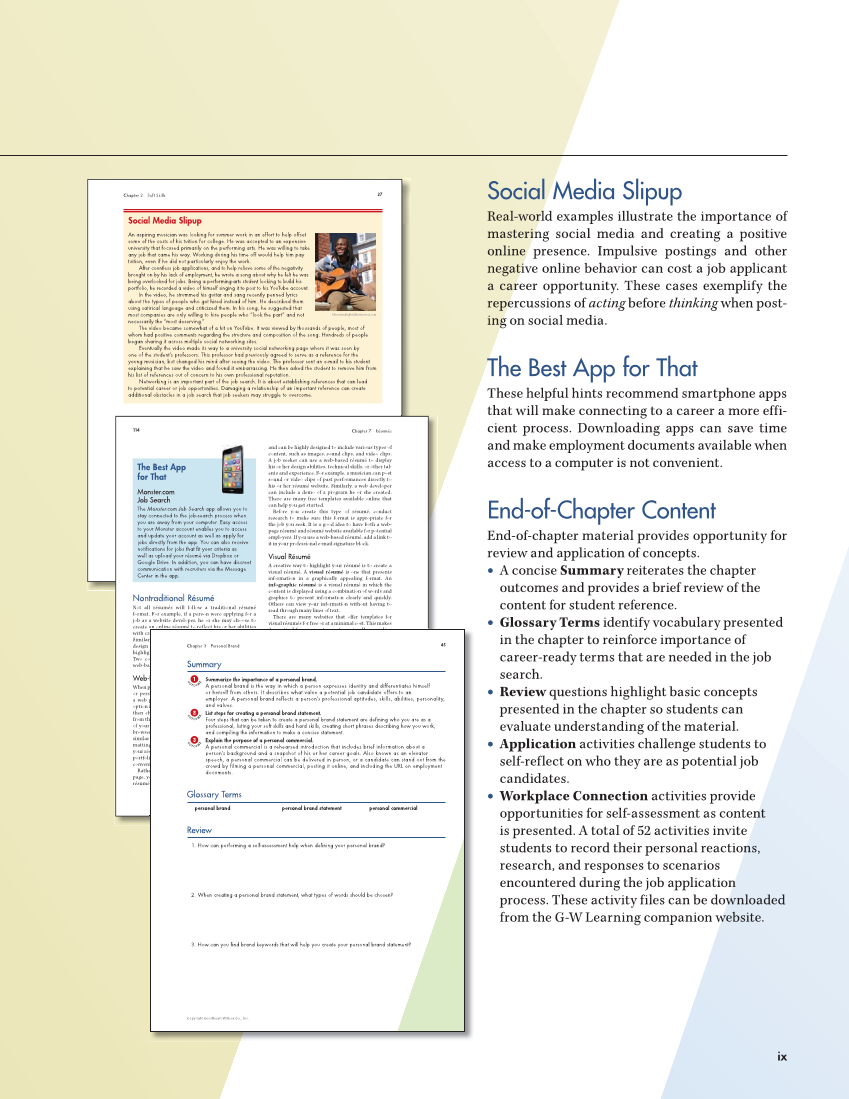 Digital Citizenship Digital citizenship is the standard of appropriate behavior when using technology to communicate. Good digital citizenship focuses on using technology in a pos- itive manner rather than using it for negative or illegal purposes. People who participate in the digital soci- ety have a legal responsibility for their online actions, whether those actions are ethical or unethical. Company Equipment Company equipment is designated for business-related functions, not for use. Office equipment includes desktop computers, phones, and photocopy machines. This equipment is provided to employees to improve efficiency. In many cases, it would be impossi- ble for an employee to perform his or her job without it. Many businesses have codes of conduct that outline employee guidelines for visiting websites and rules for downloading to company computers. These rules protect the business’ computer system and its private information. Company-owned mobile devices, such as smart- phones or tablets, are also company property and should not be used for personal reasons. Company policies for appropriate communication and workplace behavior should be followed at all times. BYOD Some organizations have a bring-your-own-device (BYOD) policy that allows employees to use their own devices to perform business related functions. In a BYOD scenario, an employee owns the devices used to conduct work. However, company-specified usage guidelines for use must be followed at all times while using the personal device for business purposes. Software Downloads It is unethical and illegal for an employee to use com- pany equipment to download software that has not been purchased and registered by the employer. A license is the legal permission to use a software program and must be on file with the employer. Social Media Slipup An aspiring musician was looking for summer work in an effort to help offset some of the costs of his tuition for college. He was accepted to an expensive university that focused primarily on the performing arts. He was willing to take any job that came his way. Working during his time off would help him pay tuition, even if he did not particularly enjoy the work. After countless job applications, and to help relieve some of the negativity brought on by his lack of employment, he wrote a song about why he felt he was being overlooked for jobs. Being a performing-arts student looking to build his portfolio, he recorded a video of himself singing it to post to his YouTube account. In the video, he strummed his guitar and sang recently penned lyrics about the types of people who get hired instead of him. He described them using satirical language and criticized them. In his song, he suggested that most companies are only willing to hire people who “look the part” and not necessarily the “most deserving.” The video became somewhat of a hit on YouTube. It was viewed by thousands of people, most of whom had positive comments regarding the structure and composition of the song. Hundreds of people began sharing it across multiple social networking sites. Eventually the video made its way to a university social networking page where it was seen by one of the student’s professors. This professor had previously agreed to serve as a reference for the young musician, but changed his mind after seeing the video. The professor sent an e-mail to his student explaining that he saw the video and found it embarrassing. He then asked the student to remove him from his list of references out of concern to his own professional reputation. Networking is an important part of the job search. It is about establishing references that can lead to potential career or job opportunities. Damaging a relationship of an important reference can create additional obstacles in a job search that job seekers may struggle to overcome. Christian Kieff er/Shutterstock.com Copyright Goodheart-Willcox Co., Inc.recruiters 27 Chapter 2 Soft Skills Social Media Slipup Real-world examples illustrate the importance of mastering social media and creating a positive online presence. Impulsive postings and other negative online behavior can cost a job applicant a career opportunity. These cases exemplify the repercussions of acting before thinking when post- ing on social media. The Best App for That These helpful hints recommend smartphone apps that will make connecting to a career a more effi- cient process. Downloading apps can save time and make employment documents available when access to a computer is not convenient. End-of-Chapter Content End-of-chapter material provides opportunity for review and application of concepts. • A concise Summary reiterates the chapter outcomes and provides a brief review of the content for student reference. • Glossary Terms identify vocabulary presented in the chapter to reinforce importance of career-ready terms that are needed in the job search. • Review questions highlight basic concepts presented in the chapter so students can evaluate understanding of the material. • Application activities challenge students to self-reflect on who they are as potential job candidates. • Workplace Connection activities provide opportunities for self-assessment as content is presented. A total of 52 activities invite students to record their personal reactions, research, and responses to scenarios encountered during the job application process. These activity files can be downloaded from the G-W Learning companion website. Nontraditional Résumé Not all résumés will follow a traditional résumé format. For example, if a person were applying for a job as a website developer, he or she may choose to create an online résumé to reflect his or her abilities with creating and maintaining online environments. Similarly, if a person were applying for a graphic design position, he or she can create a that highlights his or her strengths in a graphical format. Two common types of nontraditional 