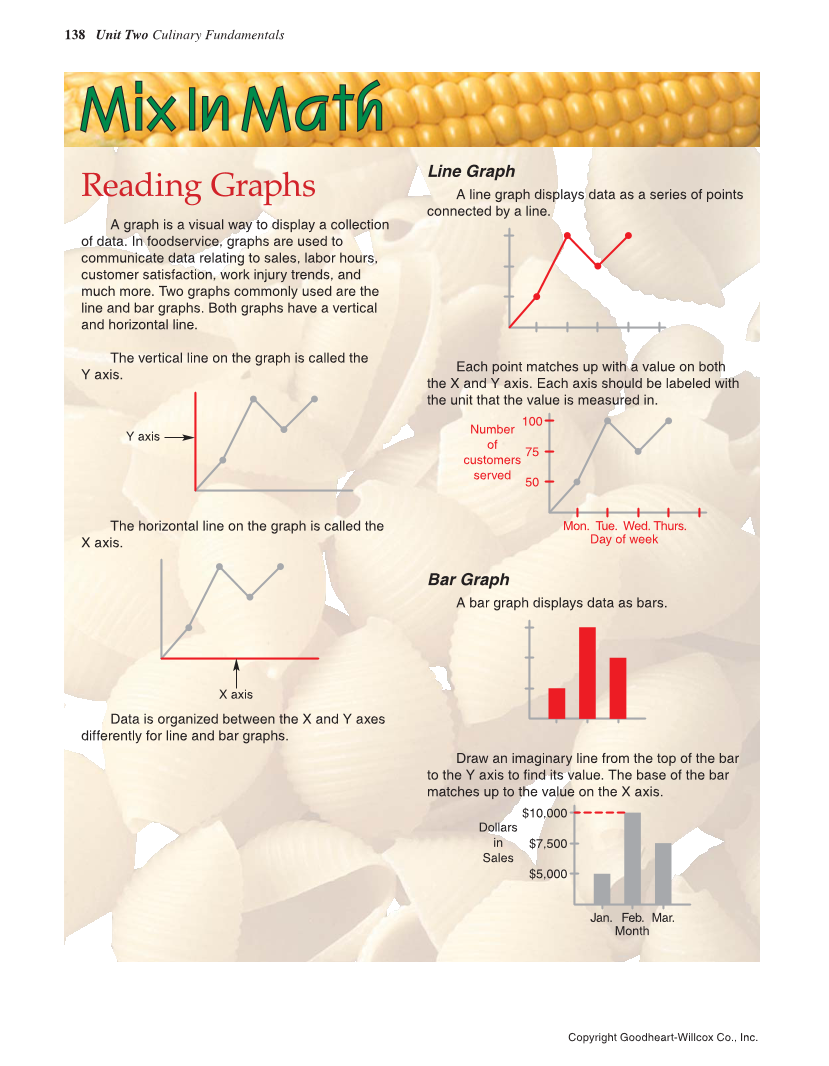 138 Unit Two Culinary Fundamentals Copyright Goodheart-Willcox Co., Inc. Reading Graphs A graph is a visual way to display a collection of data. In foodservice, graphs are used to communicate data relating to sales, labor hours, customer satisfaction, work injury trends, and much more. Two graphs commonly used are the line and bar graphs. Both graphs have a vertical and horizontal line. The vertical line on the graph is called the Y axis. Y axis The horizontal line on the graph is called the X axis. X axis Data is organized between the X and Y axes differently for line and bar graphs. M i x I n M a t h Line Graph A line graph displays data as a series of points connected by a line. Each point matches up with a value on both the X and Y axis. Each axis should be labeled with the unit that the value is measured in. Number of customers served Day of week Mon. Tue. Wed. Thurs. 50 75 100 Bar Graph A bar graph displays data as bars. Draw an imaginary line from the top of the bar to the Y axis to find its value. The base of the bar matches up to the value on the X axis. Dollars in Sales Month Jan. Feb. Mar. $5,000 $7,500 $10,000