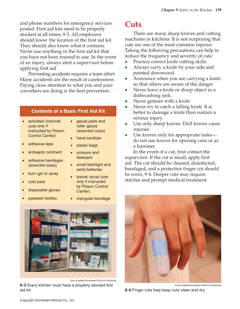 Chapter 9 Safety in the Kitchen 139 Copyright Goodheart-Willcox Co., Inc. and phone numbers for emergency services posted. First aid kits need to be properly stocked at all times, 9-3. All employees should know the location of the first aid kit. They should also know what it contains. Never use anything in the first aid kit that you have not been trained to use. In the event of an injury, always alert a supervisor before applying first aid. Preventing accidents requires a team effort. Many accidents are the result of carelessness. Paying close attention to what you and your coworkers are doing is the best prevention. Cuts There are many sharp knives and cutting machines in kitchens. It is not surprising that cuts are one of the most common injuries. Taking the following precautions can help to reduce the frequency and severity of cuts: • Practice correct knife cutting skills. • Always carry a knife by your side and pointed downward. • Announce when you are carrying a knife so that others are aware of the danger. • Never leave a knife or sharp object in a dishwashing sink. • Never gesture with a knife. • Never try to catch a falling knife. It is better to damage a knife than sustain a serious injury. • Use only sharp knives. Dull knives cause injuries. • Use knives only for appropriate tasks— do not use knives for opening cans or as a hammer. In the event of a cut, first contact the supervisor. If the cut is small, apply first aid. The cut should be cleaned, disinfected, bandaged, and a protective finger cot should be worn, 9-4. Deeper cuts may require stitches and prompt medical treatment. Contents of a Basic First Aid Kit • activated charcoal (use only if instructed by Poison Control Center) • adhesive tape • antiseptic ointment • adhesive bandages (assorted sizes) • burn gel or spray • cold pack • disposable gloves • eyewash bottles • gauze pads and roller gauze (assorted sizes) • hand sanitizer • plastic bags • scissors and tweezers • small flashlight and extra batteries • ipecac syrup (use only if instructed by Poison Control Center) • triangular bandage Draz-Koetke/Goodheart-Willcox Publisher 9-3 Every kitchen must have a properly stocked first aid kit. Draz-Koetke/Goodheart-Willcox Publisher 9-4 Finger cots help keep cuts clean and dry.