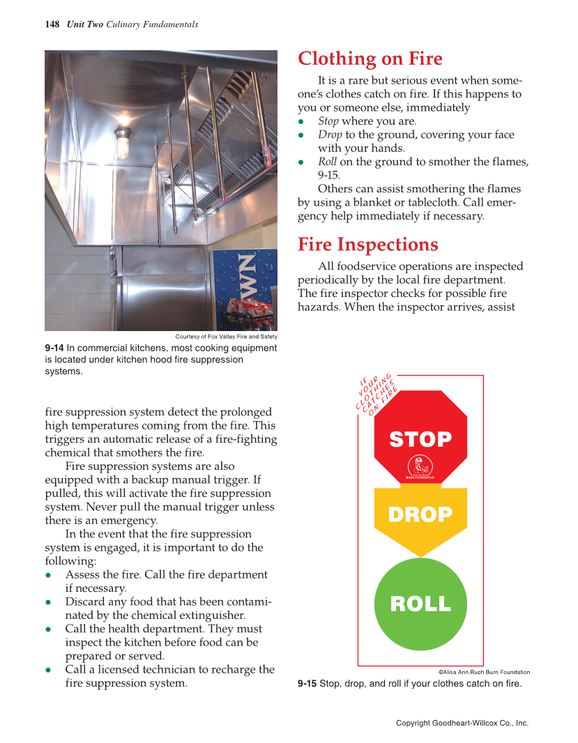 148 Unit Two Culinary Fundamentals Copyright Goodheart-Willcox Co., Inc. fire suppression system detect the prolonged high temperatures coming from the fire. This triggers an automatic release of a fire-fighting chemical that smothers the fire. Fire suppression systems are also equipped with a backup manual trigger. If pulled, this will activate the fire suppression system. Never pull the manual trigger unless there is an emergency. In the event that the fire suppression system is engaged, it is important to do the following: • Assess the fire. Call the fire department if necessary. • Discard any food that has been contami- nated by the chemical extinguisher. • Call the health department. They must inspect the kitchen before food can be prepared or served. • Call a licensed technician to recharge the fire suppression system. Clothing on Fire It is a rare but serious event when some- one’s clothes catch on fire. If this happens to you or someone else, immediately • Stop where you are. • Drop to the ground, covering your face with your hands. • Roll on the ground to smother the flames, 9-15. Others can assist smothering the flames by using a blanket or tablecloth. Call emer- gency help immediately if necessary. Fire Inspections All foodservice operations are inspected periodically by the local fire department. The fire inspector checks for possible fire hazards. When the inspector arrives, assist Courtesy of Fox Valley Fire and Safety 9-14 In commercial kitchens, most cooking equipment is located under kitchen hood fire suppression systems. DROP STOP ROLL CLOTHINGIFYOUR FIRE ©Alisa Ann Ruch Burn Foundation 9-15 Stop, drop, and roll if your clothes catch on fire.