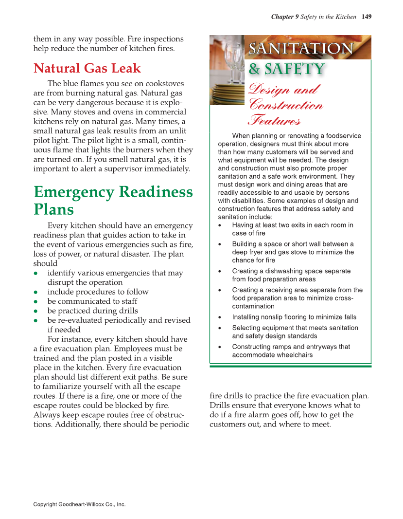 Chapter 9 Safety in the Kitchen 149 Copyright Goodheart-Willcox Co., Inc. them in any way possible. Fire inspections help reduce the number of kitchen fires. Natural Gas Leak The blue flames you see on cookstoves are from burning natural gas. Natural gas can be very dangerous because it is explo- sive. Many stoves and ovens in commercial kitchens rely on natural gas. Many times, a small natural gas leak results from an unlit pilot light. The pilot light is a small, contin- uous flame that lights the burners when they are turned on. If you smell natural gas, it is important to alert a supervisor immediately. Emergency Readiness Plans Every kitchen should have an emergency readiness plan that guides action to take in the event of various emergencies such as fire, loss of power, or natural disaster. The plan should • identify various emergencies that may disrupt the operation • include procedures to follow • be communicated to staff • be practiced during drills • be re-evaluated periodically and revised if needed For instance, every kitchen should have a fire evacuation plan. Employees must be trained and the plan posted in a visible place in the kitchen. Every fire evacuation plan should list different exit paths. Be sure to familiarize yourself with all the escape routes. If there is a fire, one or more of the escape routes could be blocked by fire. Always keep escape routes free of obstruc- tions. Additionally, there should be periodic fire drills to practice the fire evacuation plan. Drills ensure that everyone knows what to do if a fire alarm goes off, how to get the customers out, and where to meet. Design and Construction Features When planning or renovating a foodservice operation, designers must think about more than how many customers will be served and what equipment will be needed. The design and construction must also promote proper sanitation and a safe work environment. They must design work and dining areas that are readily accessible to and usable by persons with disabilities. Some examples of design and construction features that address safety and sanitation include: • Having at least two exits in each room in case of fire • Building a space or short wall between a deep fryer and gas stove to minimize the chance for fire • Creating a dishwashing space separate from food preparation areas • Creating a receiving area separate from the food preparation area to minimize cross- contamination • Installing nonslip flooring to minimize falls • Selecting equipment that meets sanitation and safety design standards • Constructing ramps and entryways that accommodate wheelchairs Sanitation & safety