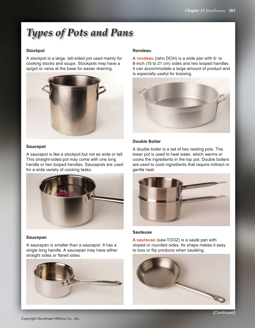 Copyright Goodheart-Willcox Co., Inc. Chapter 13 Smallwares 203 Types of Pots and Pans Stockpot A stockpot is a large, tall-sided pot used mainly for cooking stocks and soups. Stockpots may have a spigot or valve at the base for easier draining. Saucepot A saucepot is like a stockpot but not as wide or tall. This straight-sided pot may come with one long handle or two looped handles. Saucepots are used for a wide variety of cooking tasks. Saucepan A saucepan is smaller than a saucepot. It has a single long handle. A saucepan may have either straight sides or flared sides. Rondeau A rondeau (rahn DOH) is a wide pan with 6- to 8-inch (15 to 21 cm) sides and two looped handles. It can accommodate a large amount of product and is especially useful for braising. Double Boiler A double boiler is a set of two nesting pots. The lower pot is used to heat water, which warms or cooks the ingredients in the top pot. Double boilers are used to cook ingredients that require indirect or gentle heat. Sauteuse A sauteuse (saw-TOOZ) is a sauté pan with sloped or rounded sides. Its shape makes it easy to toss or flip products when sautéing. (Continued)